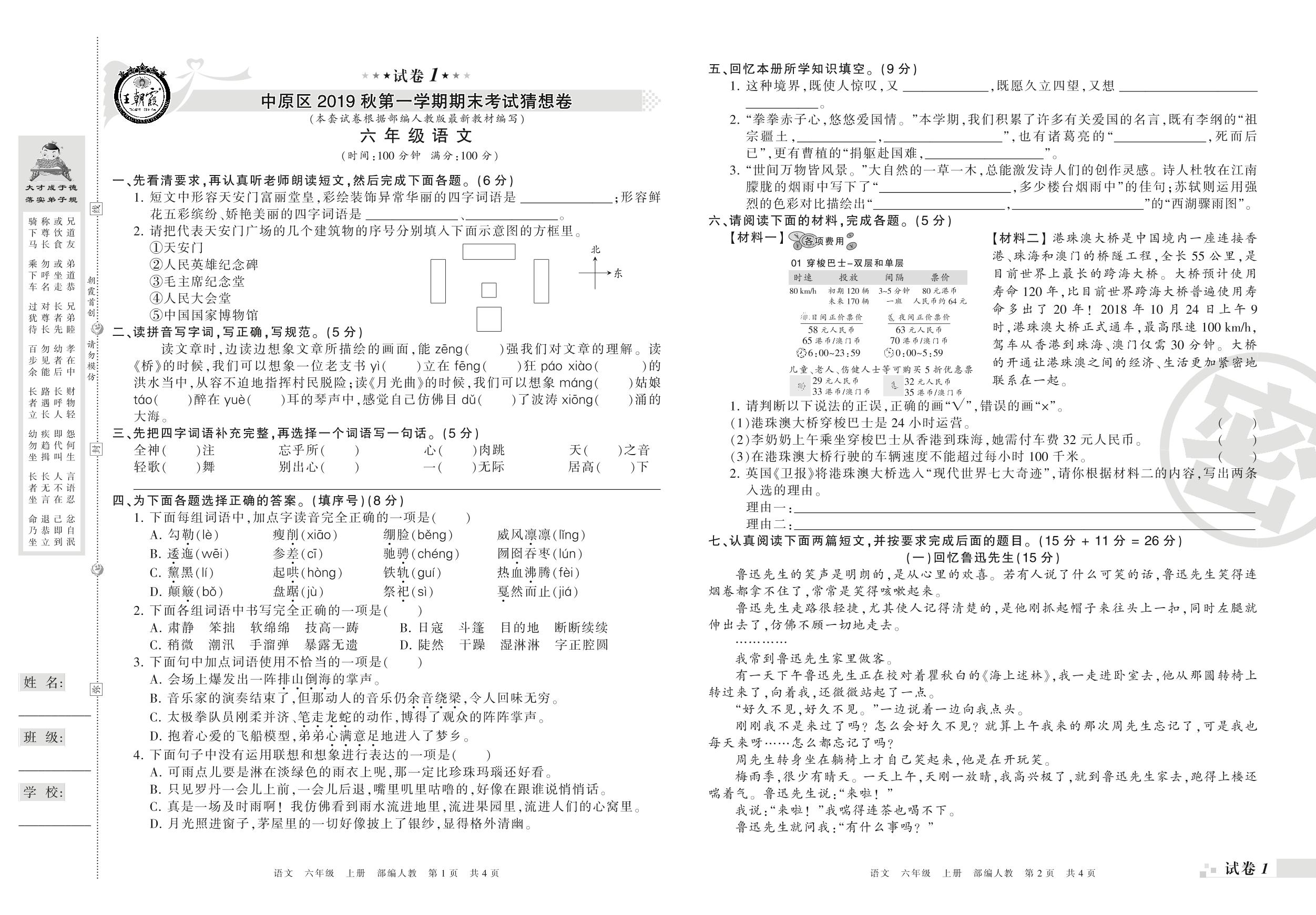 2019-2020学年第一学期郑州市中原区猜想卷六年级语文试卷(人教版)【1】