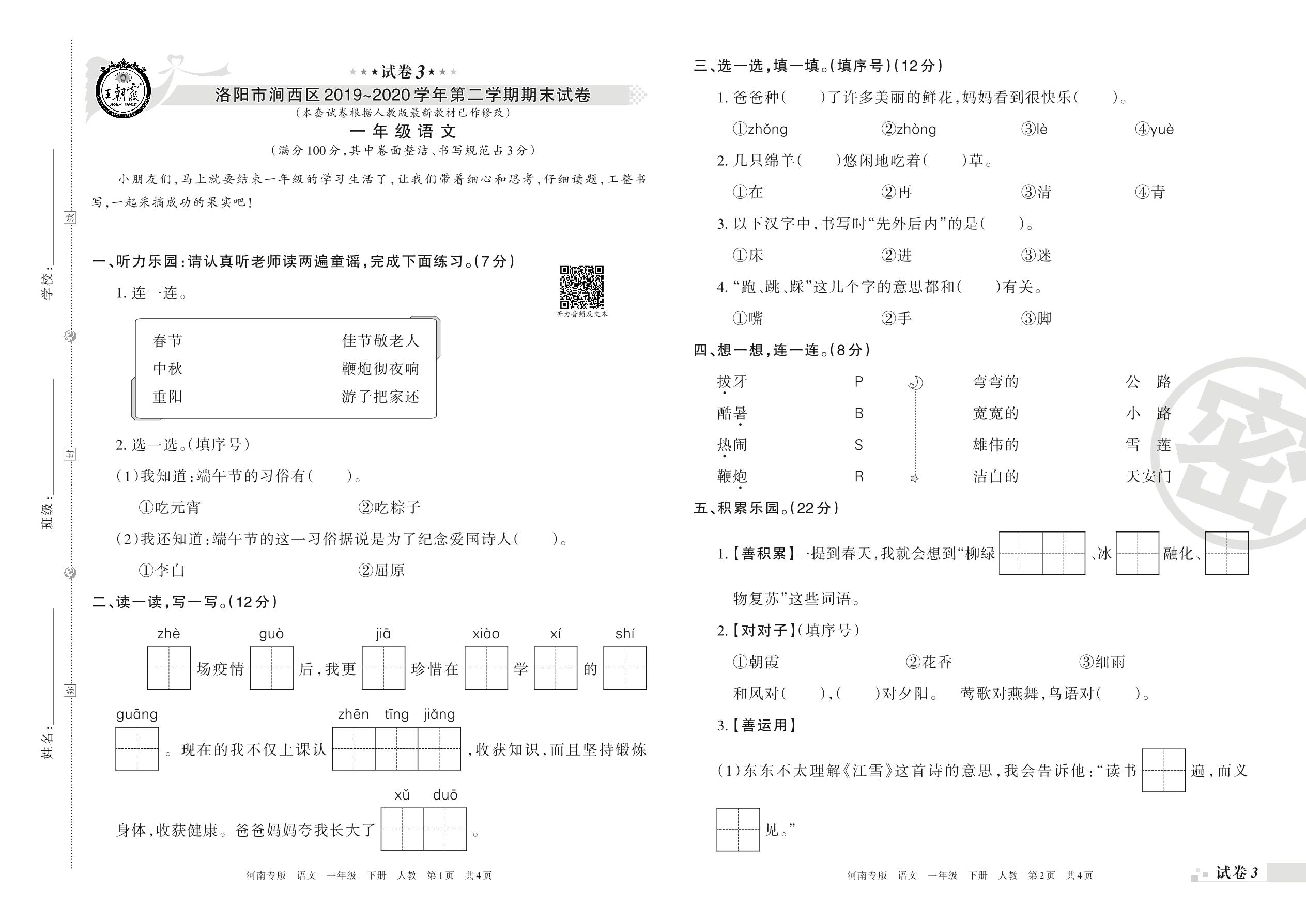2019-2020学年第二学期洛阳市涧西区一年级语文试卷(人教版)【3】