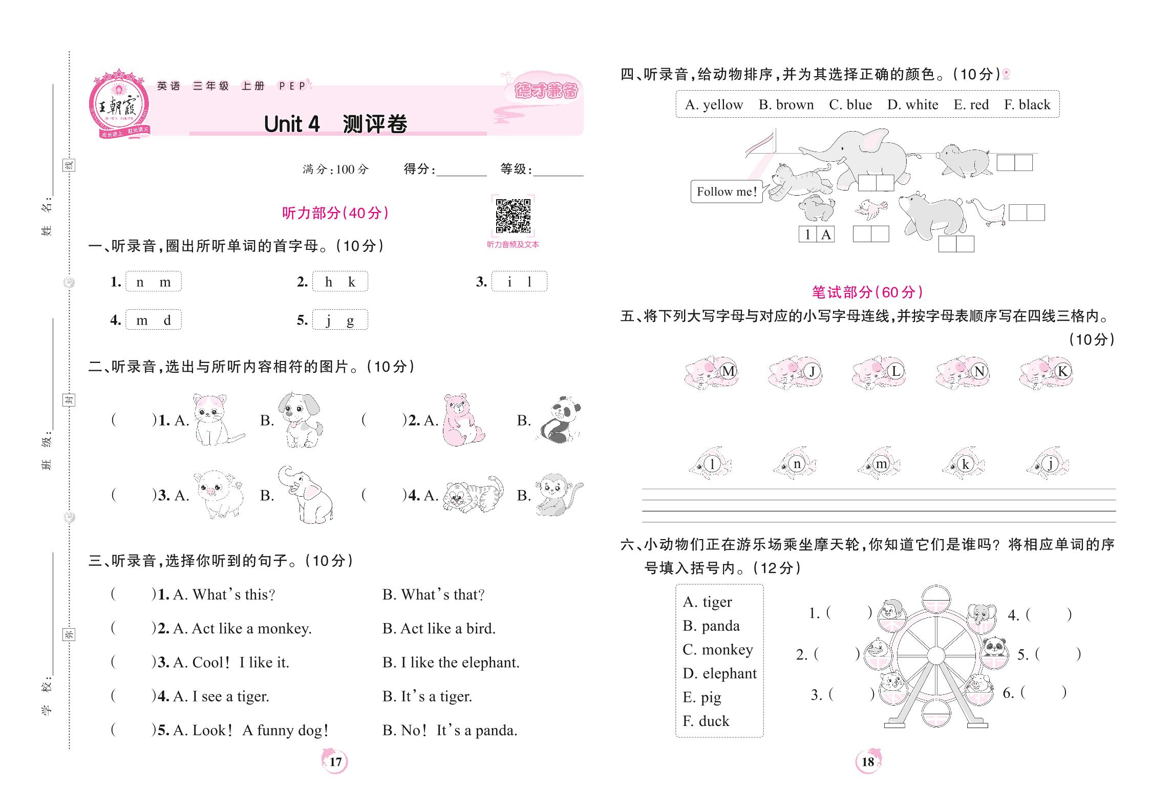 2022上册三年级英语人教PEP版 Unit 4 测评卷