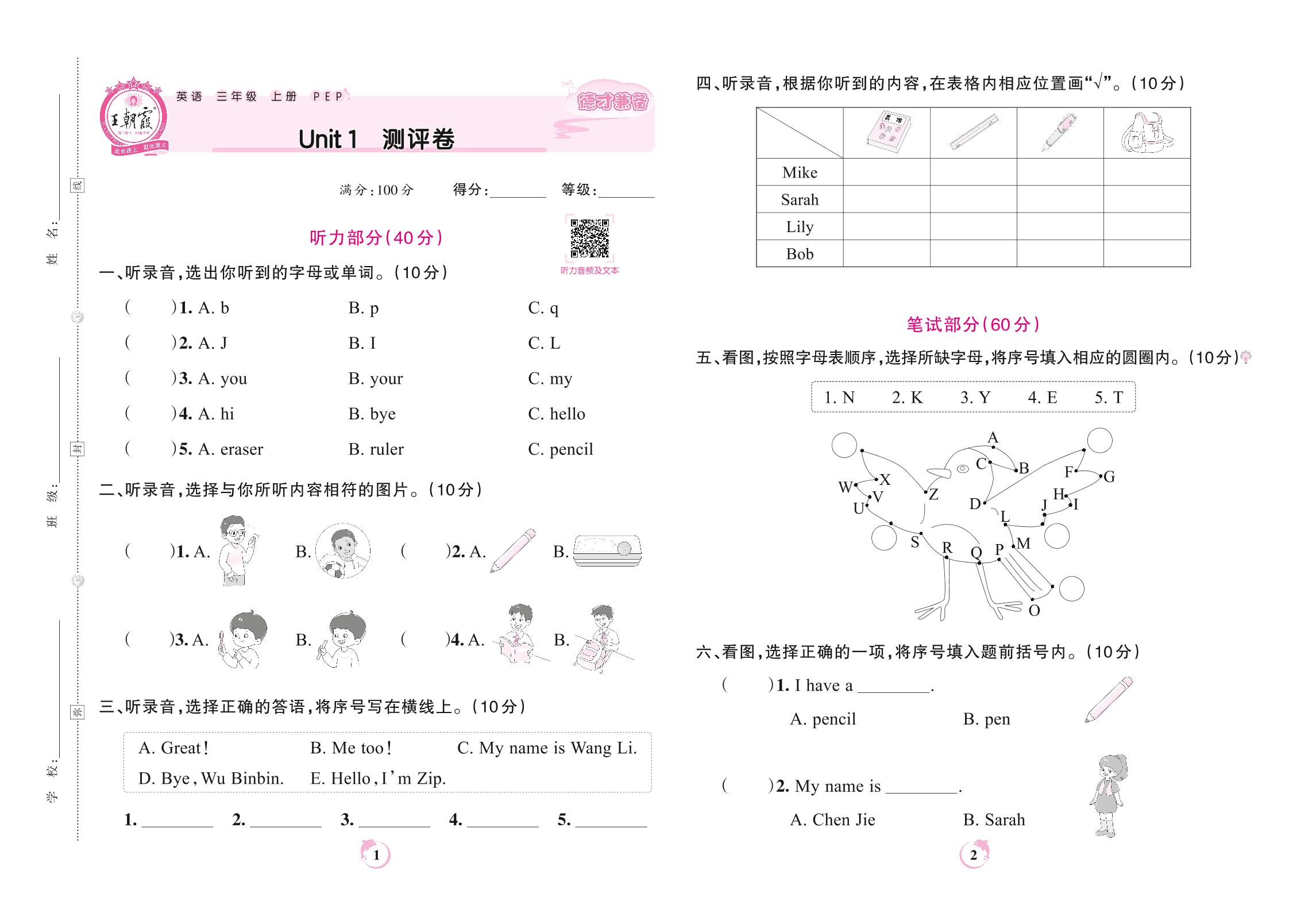 2022上册三年级英语人教PEP版 Unit 1 测评卷