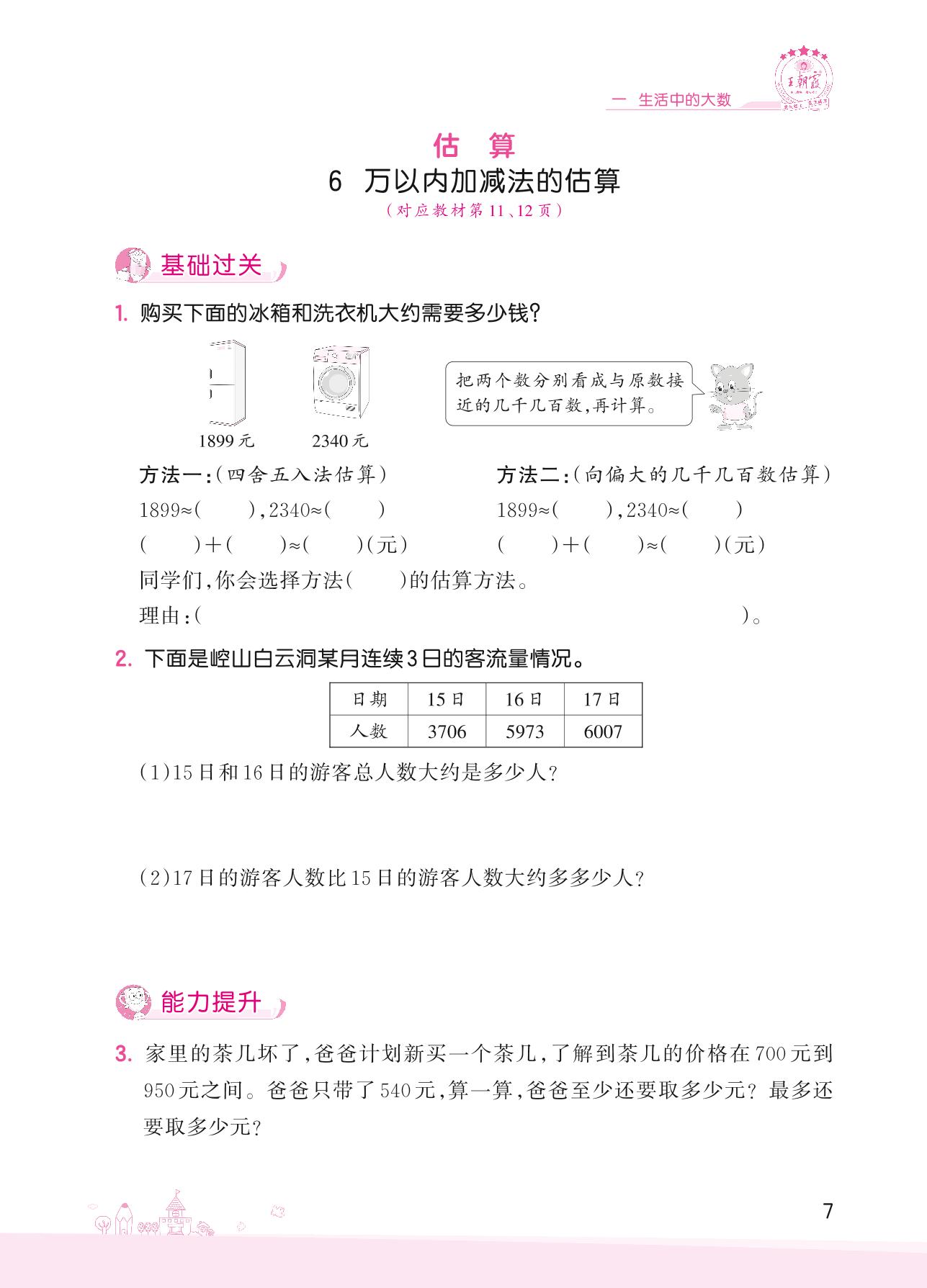2022上册三年级数学冀教版 一 生活中的大数——6 万以内加减法的估算