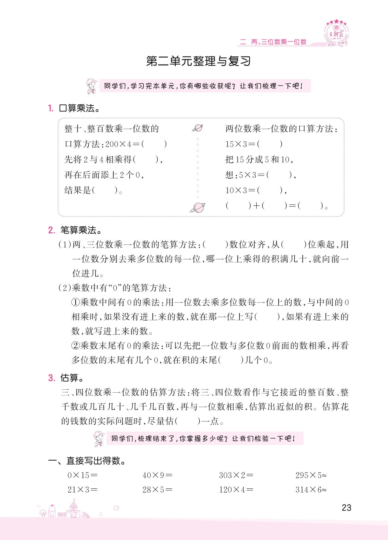 2022上册三年级数学冀教版 二 两、三位数乘一位数——第二单元整理与复习