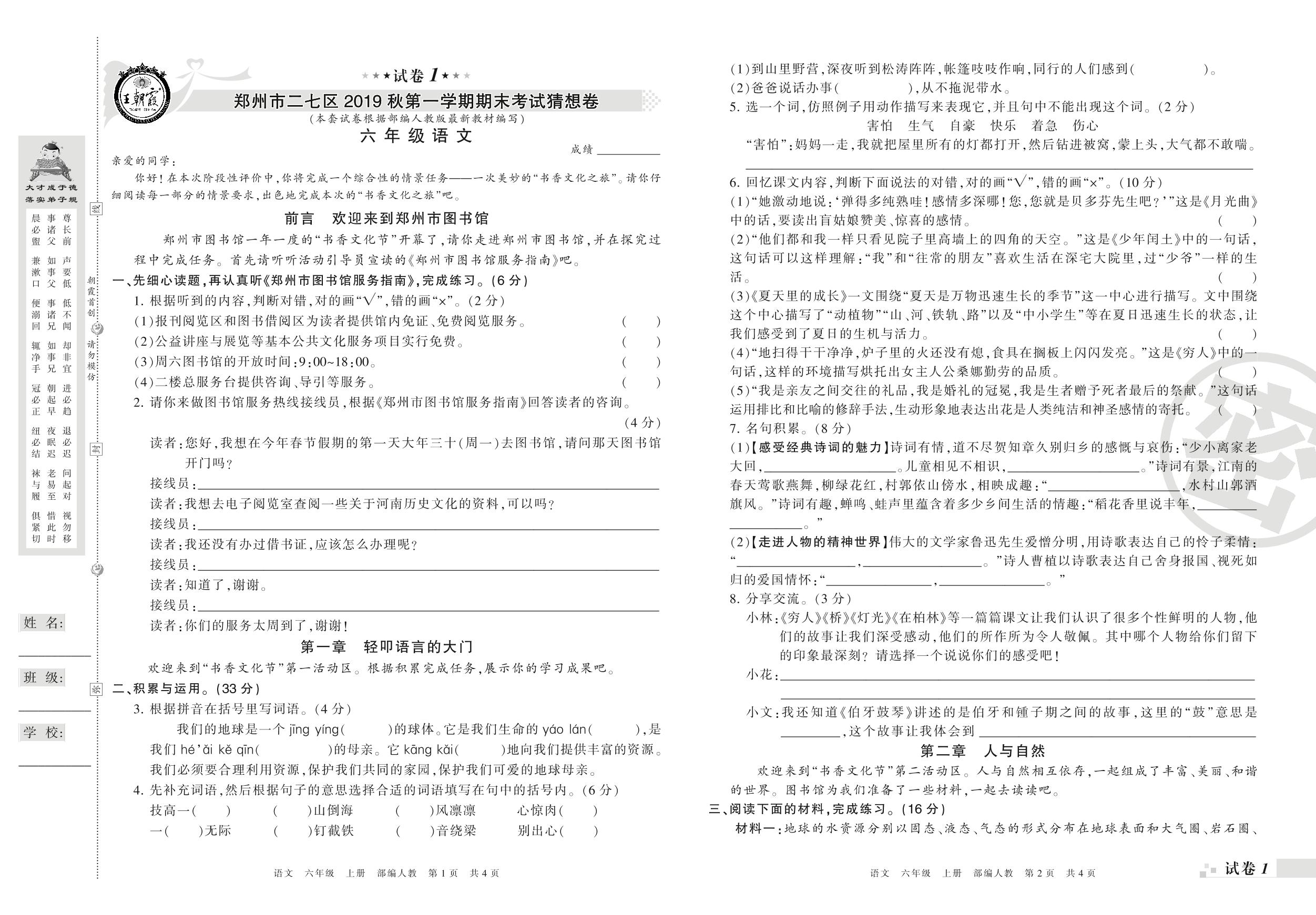 2019-2020学年第一学期郑州市二七区猜想卷六年级语文试卷(人教版)【1】