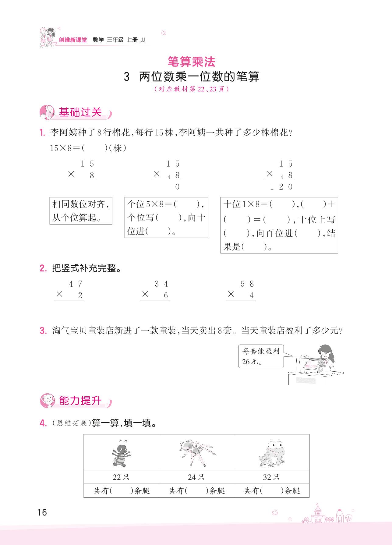 2022上册三年级数学冀教版 二 两、三位数乘一位数——3 两位数乘一位数的笔算
