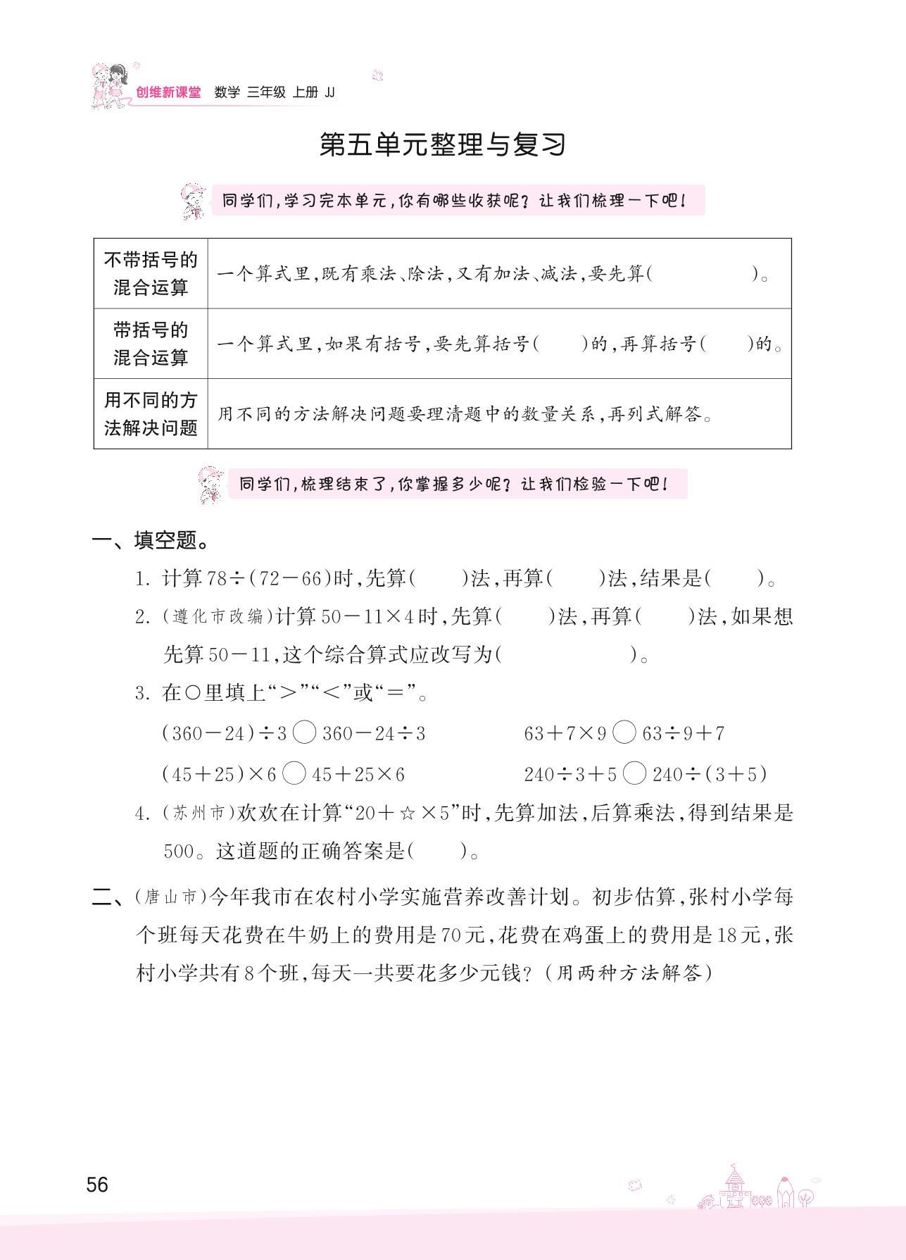 2022上册三年级数学冀教版 五 四则混合运算(一)——第五单元整理与复习
