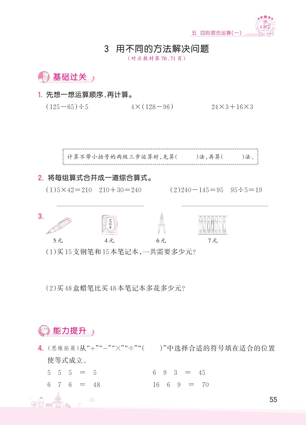 2022上册三年级数学冀教版 五 四则混合运算(一)——3 用不同的方法解决问题