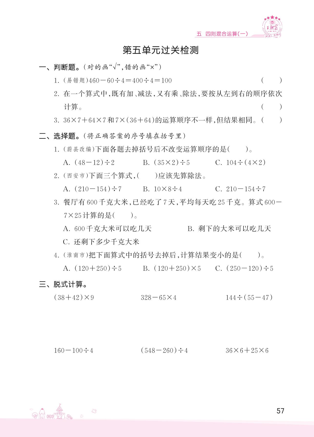 2022上册三年级数学冀教版 五 四则混合运算(一)——第五单元过关检测