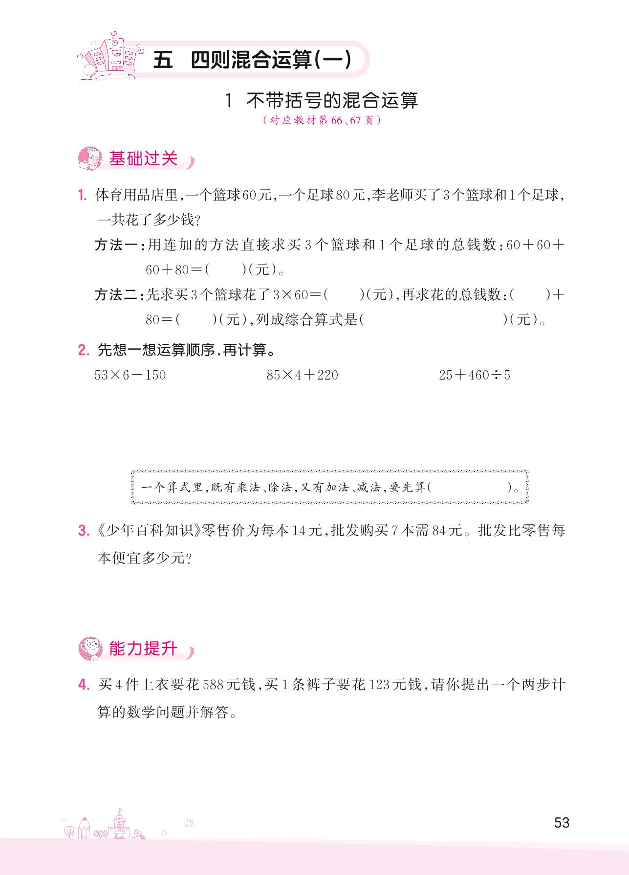 2022上册三年级数学冀教版 五 四则混合运算(一)——1 不带括号的混合运算