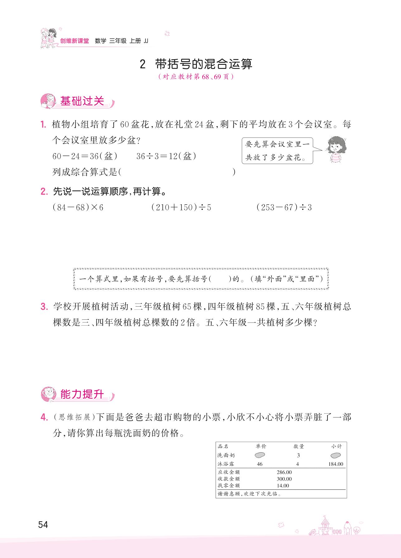 2022上册三年级数学冀教版 五 四则混合运算(一)——2 带括号的混合运算