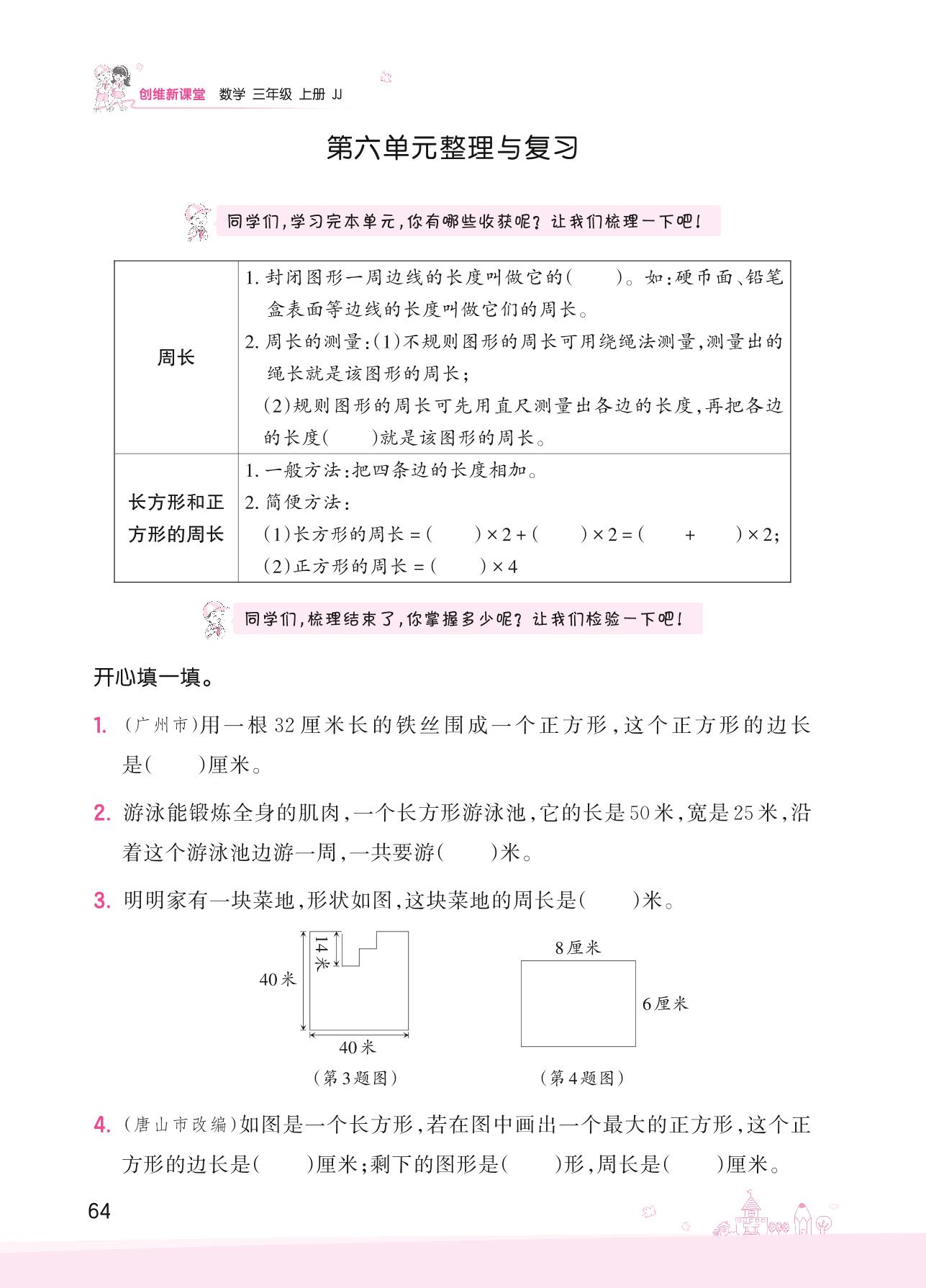 2022上册三年级数学冀教版 六 长方形和正方形的周长——第六单元整理与复习