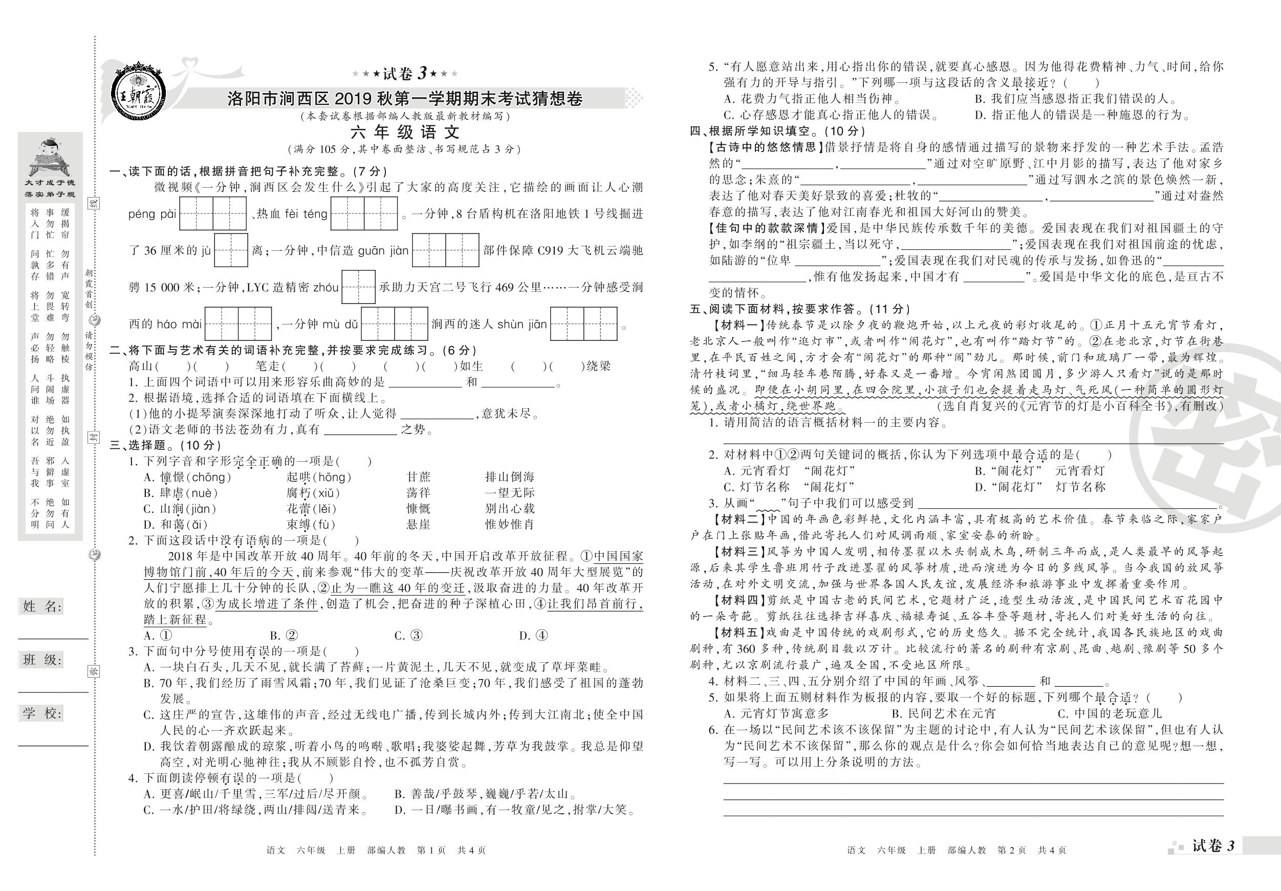 2019-2020学年第一学期洛阳市涧西区猜想卷六年级语文试卷(人教版)【3】