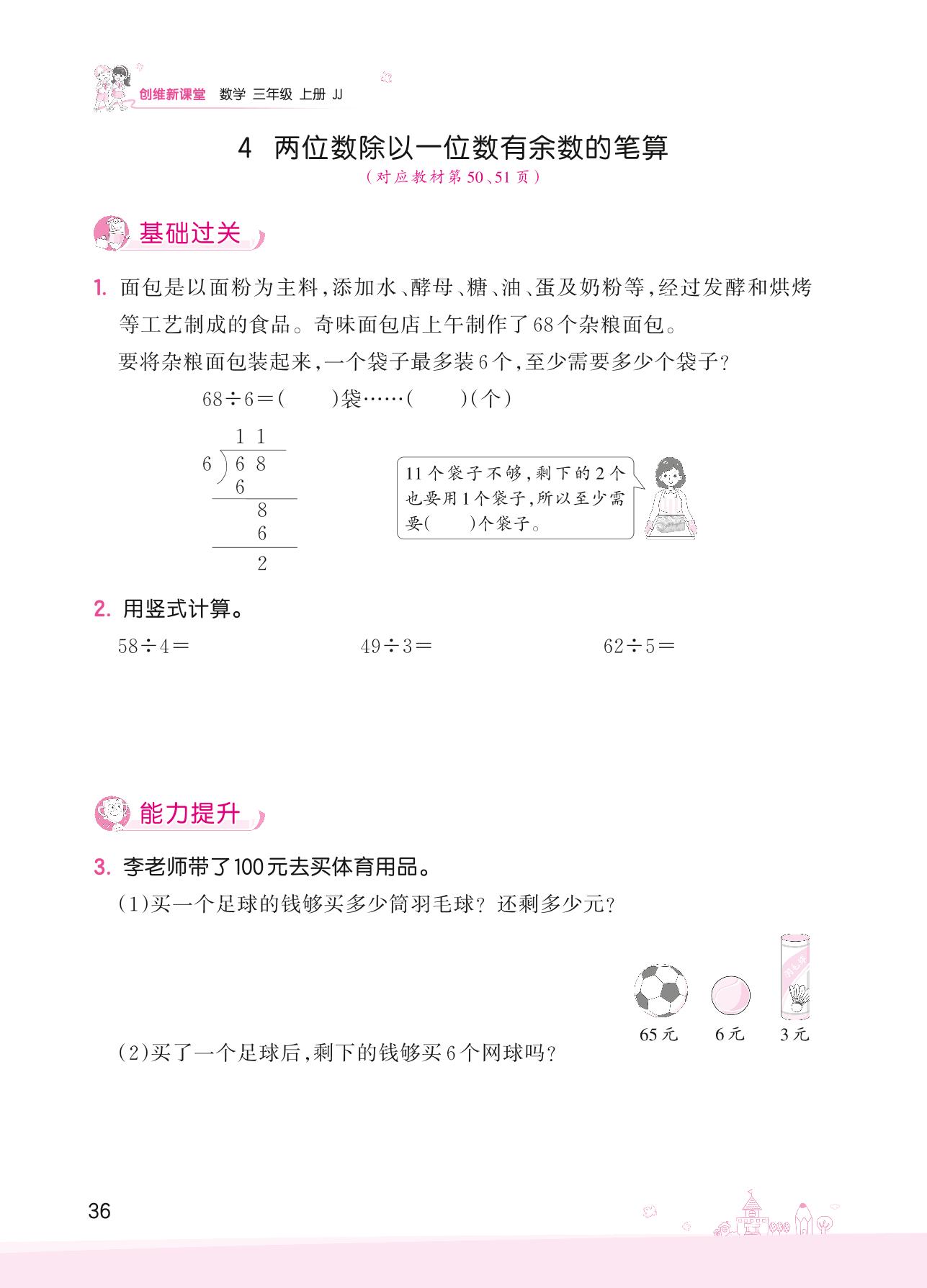 2022上册三年级数学冀教版 四 两、三位数除以一位数——4 两位数除以一位数有余数的笔算