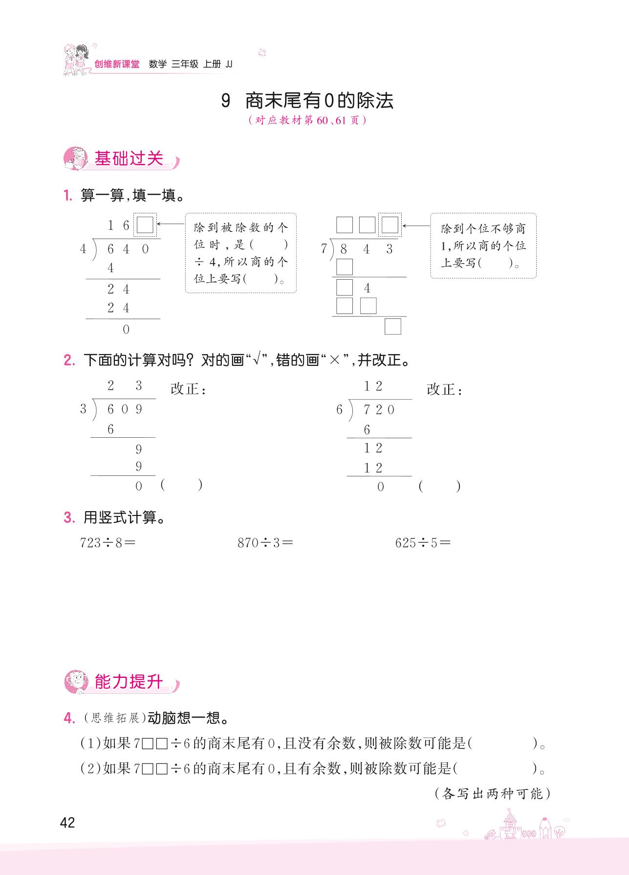 2022上册三年级数学冀教版 四 两、三位数除以一位数——9 商末尾有0的除法