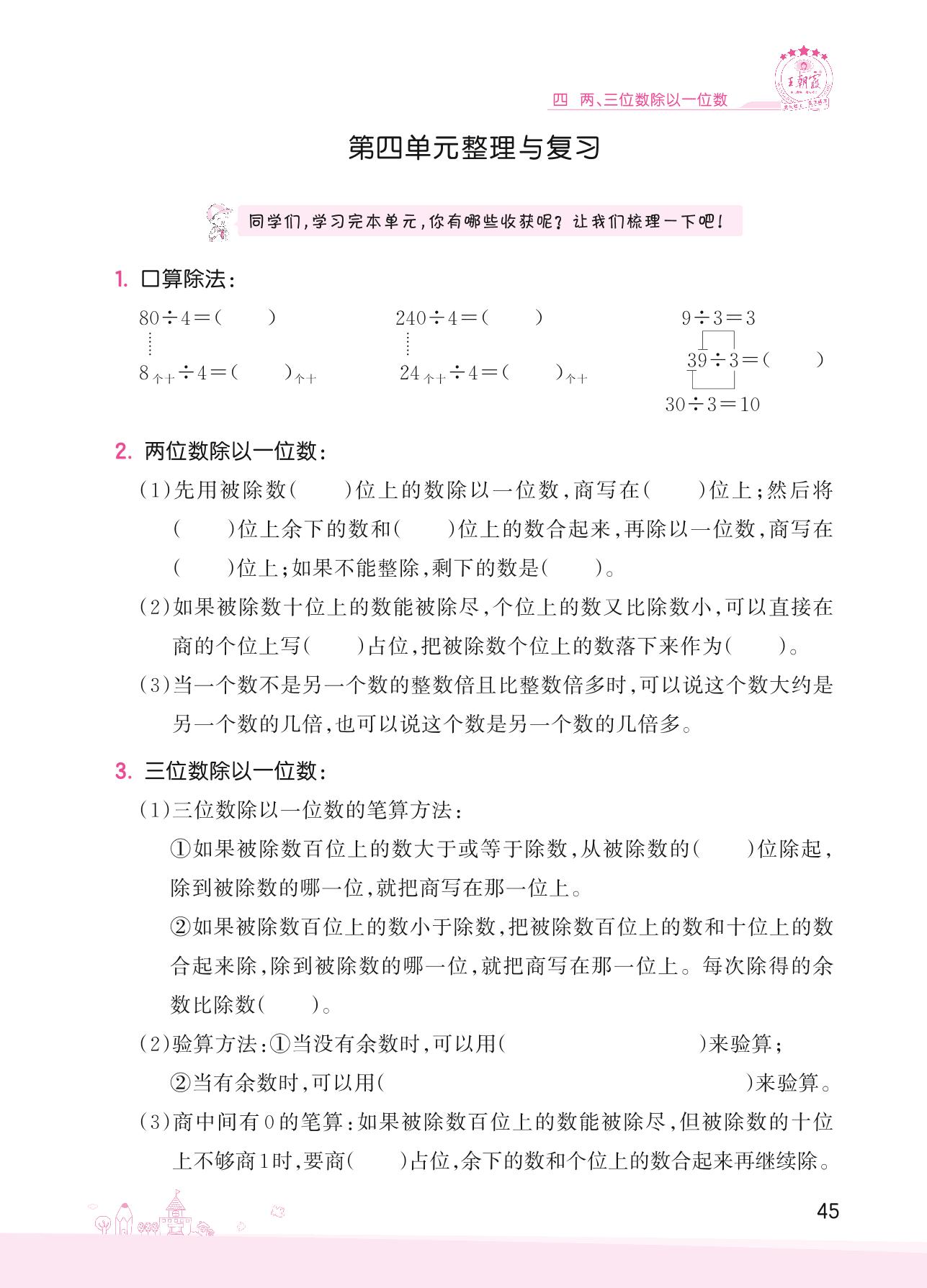 2022上册三年级数学冀教版 四 两、三位数除以一位数——第四单元整理与复习