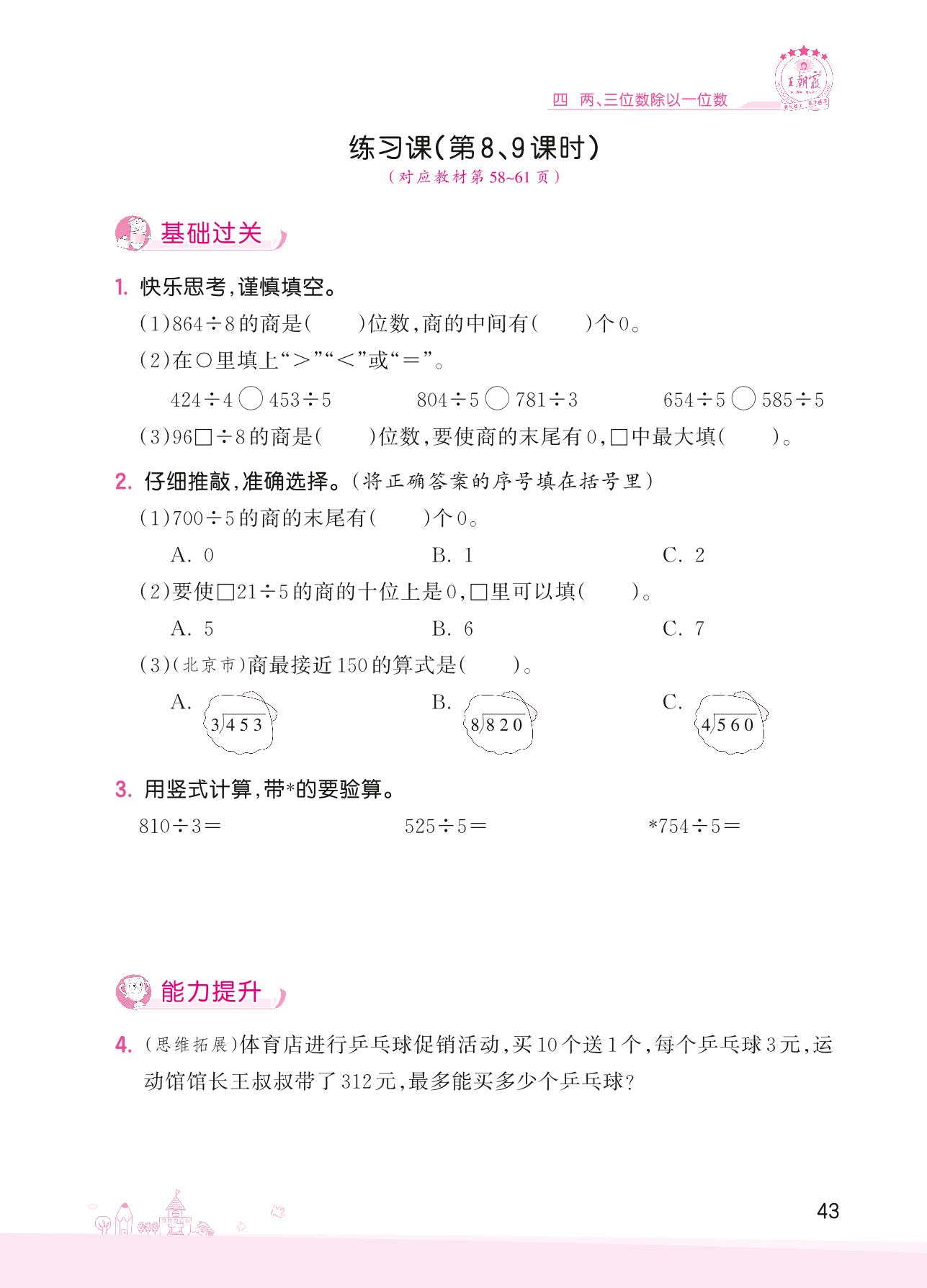 2022上册三年级数学冀教版 四 两、三位数除以一位数——练习课(第8、9课时)