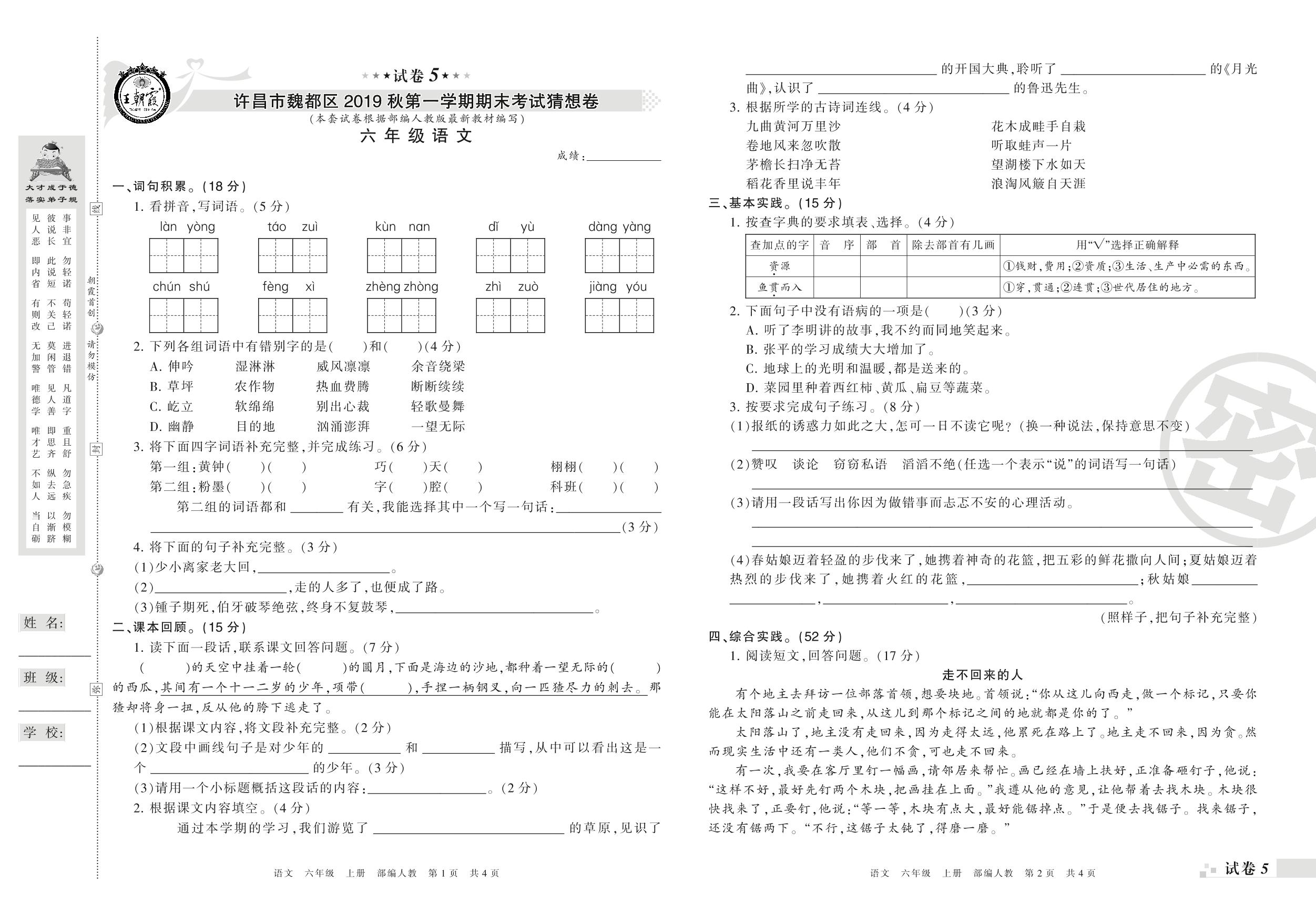 2019-2020学年第一学期许昌市魏都区猜想卷六年级语文试卷(人教版)【5】