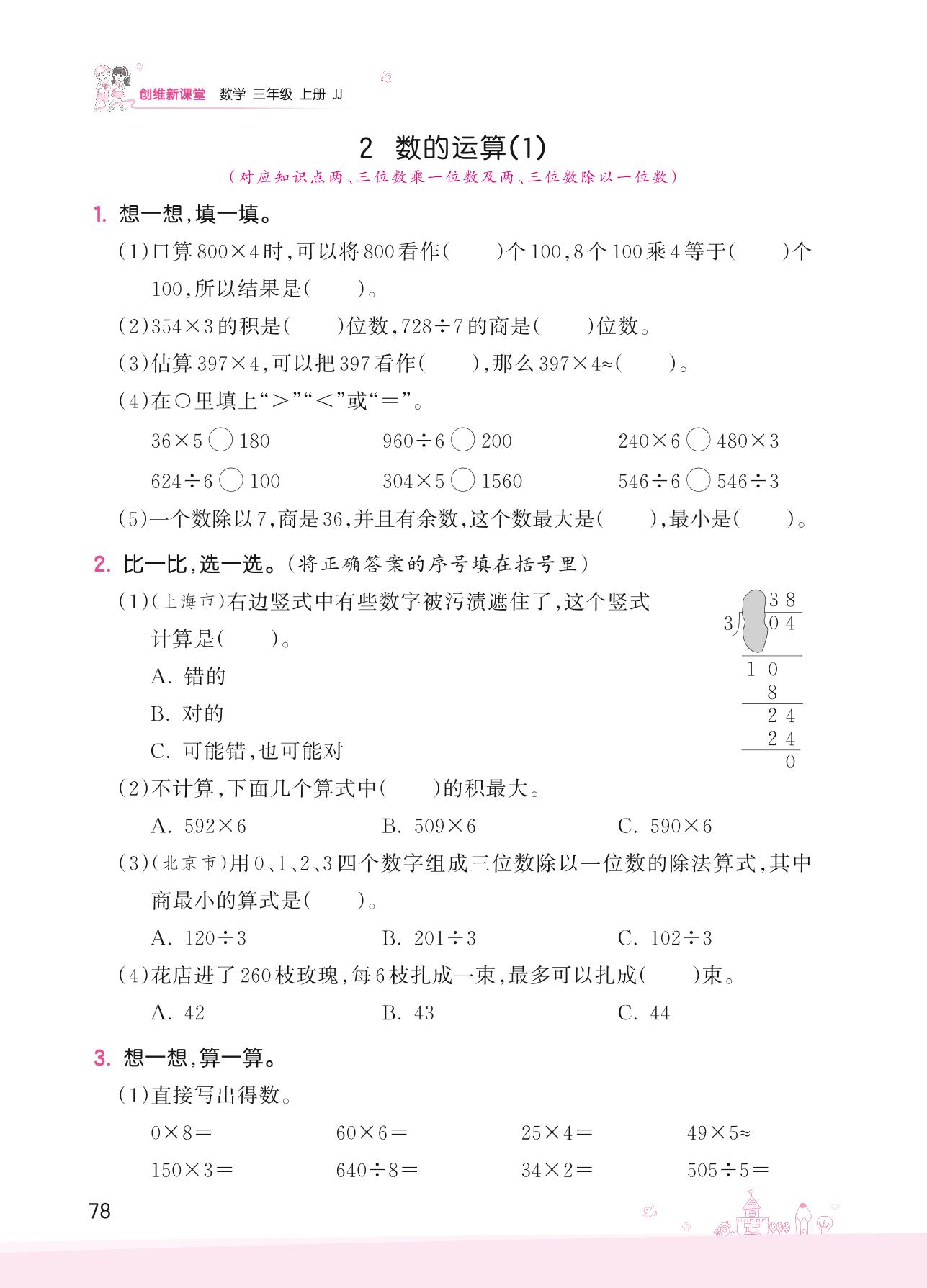 2022上册三年级数学冀教版 整理与评价——2 数的运算(1)
