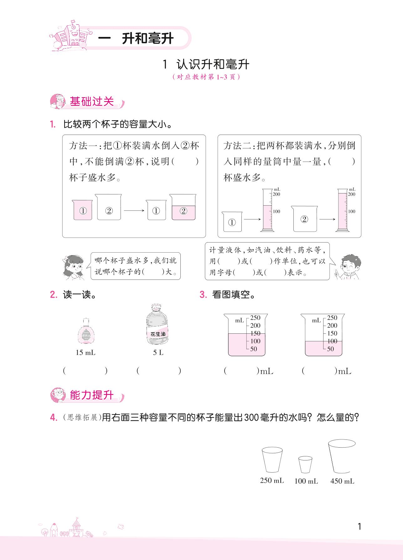 2022上册四年级数学冀教版 一 升和毫升——1 认识升和毫升