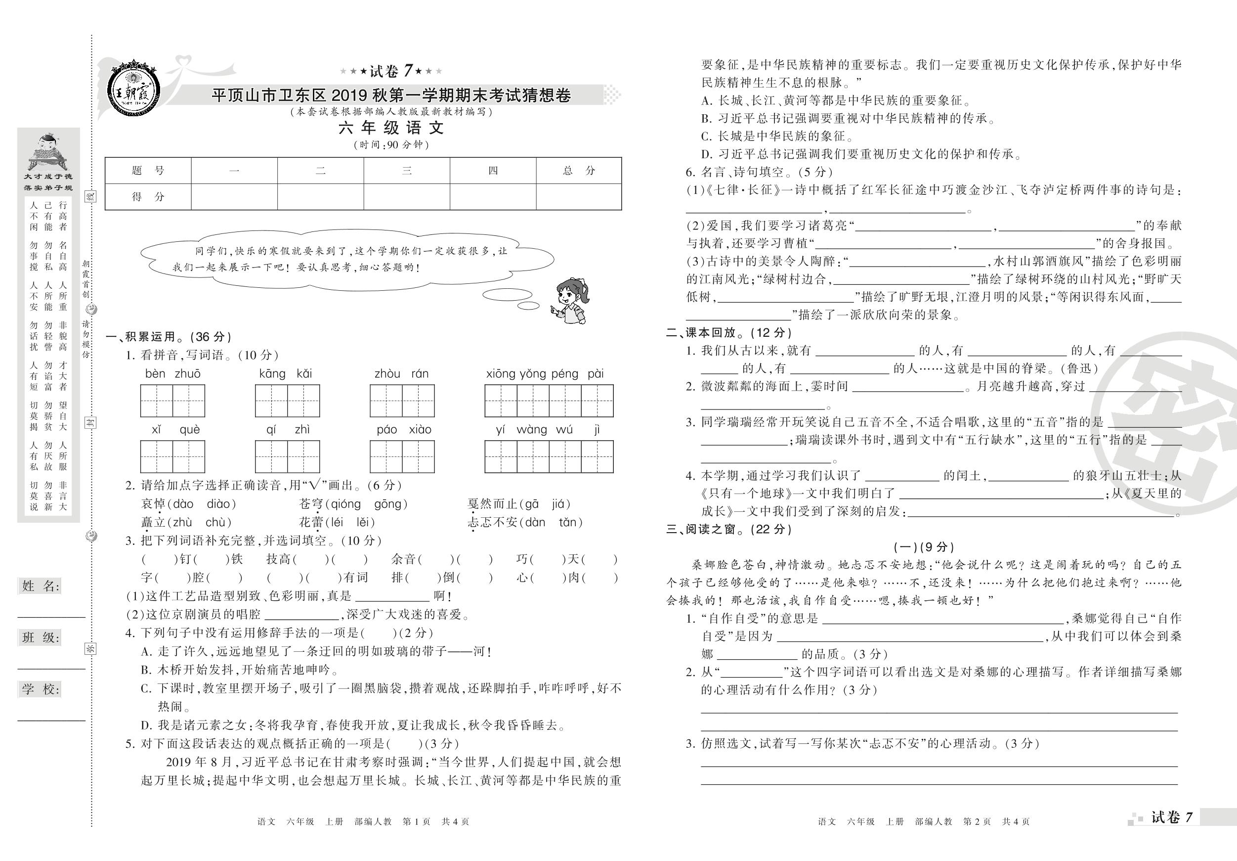 2019-2020学年第一学期平顶山市卫东区猜想卷六年级语文试卷(人教版)【7】