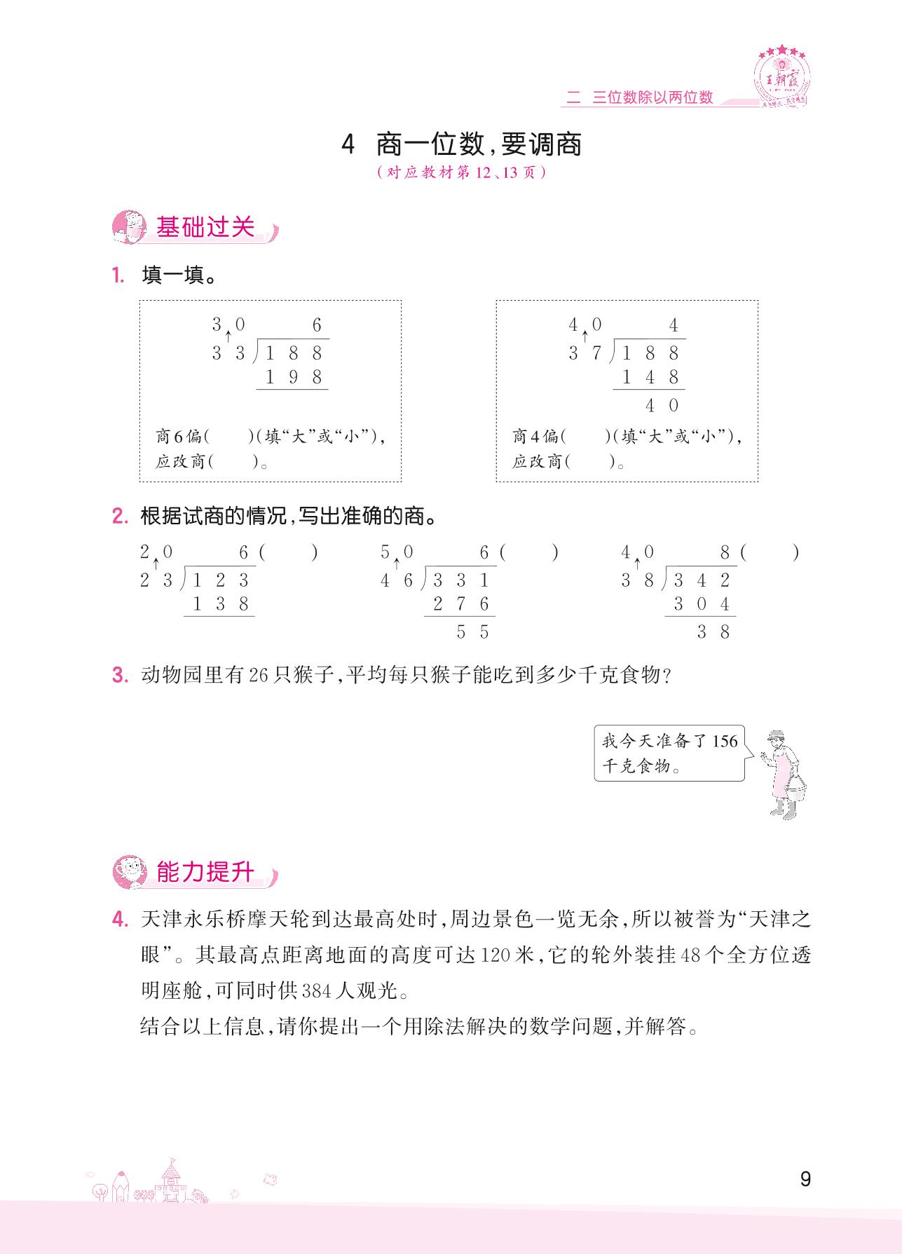 2022上册四年级数学冀教版 二 三位数除以两位数——4 商一位数,要调商