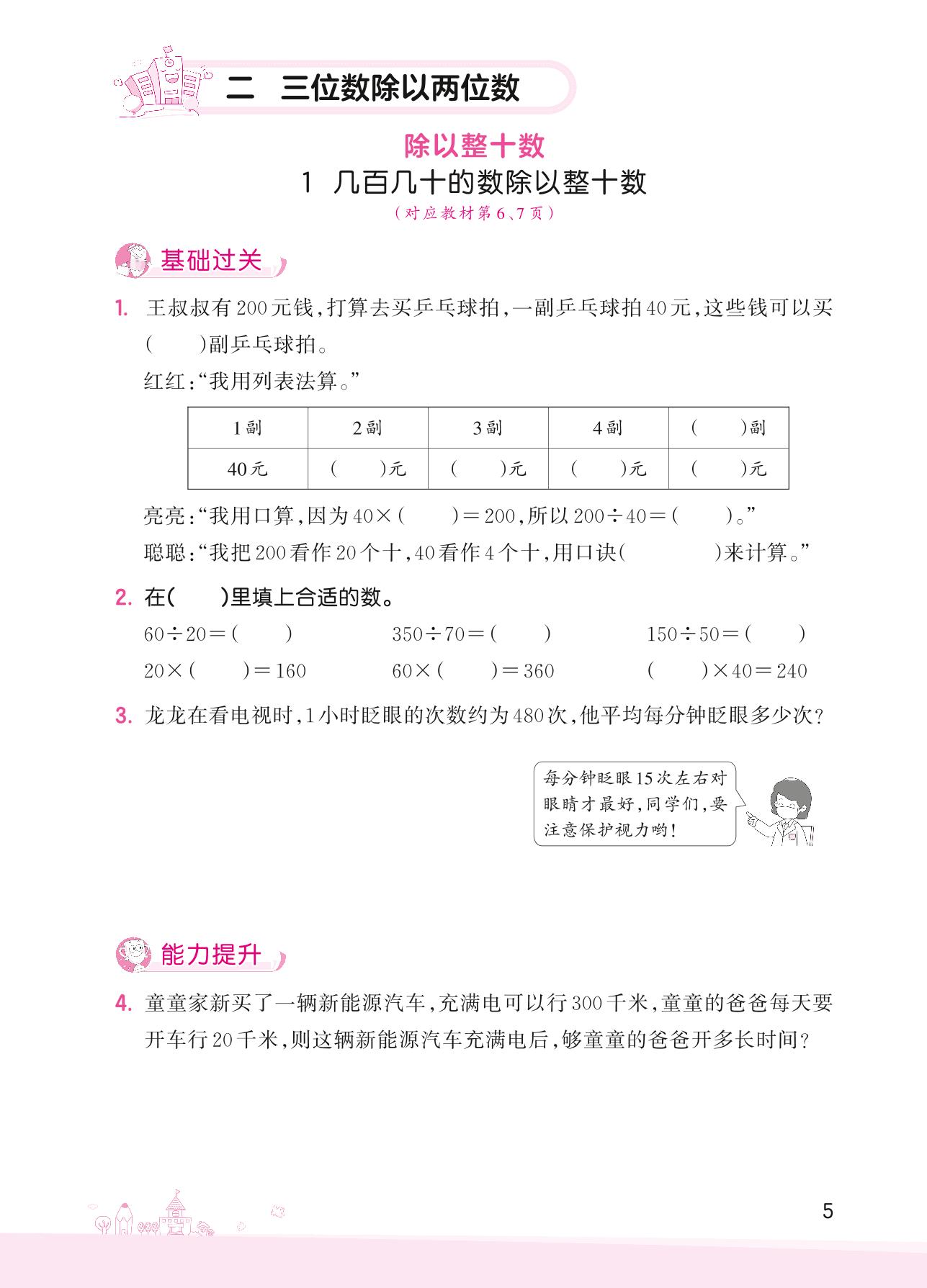 2022上册四年级数学冀教版 二 三位数除以两位数——1 几百几十的数除以整十数
