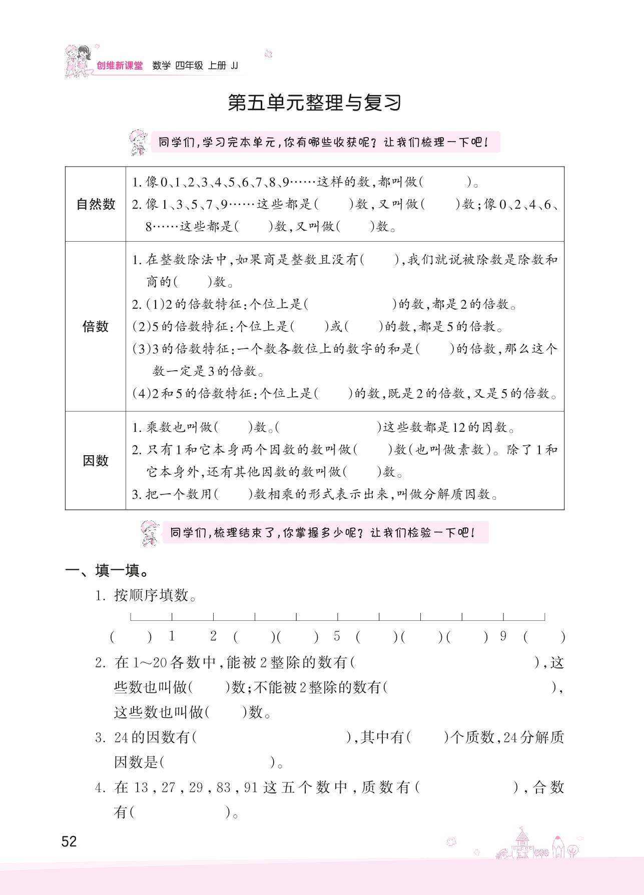 2022上册四年级数学冀教版 五 倍数和因数——第五单元整理与复习