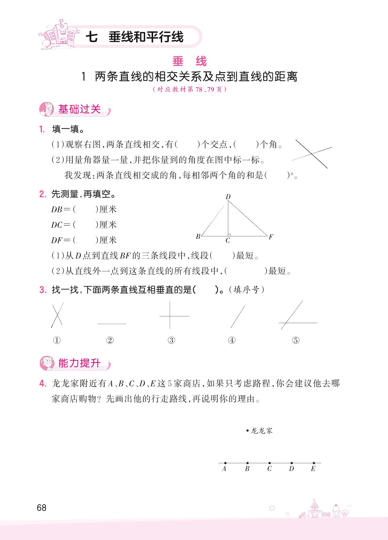 2022上册四年级数学冀教版 七 垂线和平行线——1 两条直线的相交关系及点到直线的距离