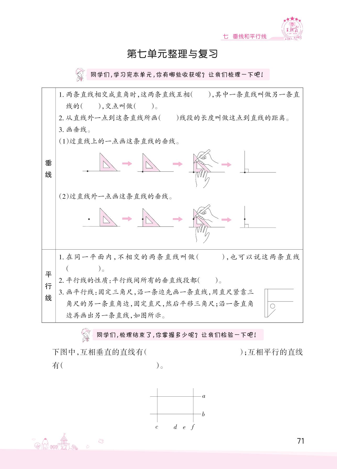 2022上册四年级数学冀教版 七 垂线和平行线——第七单元整理与复习