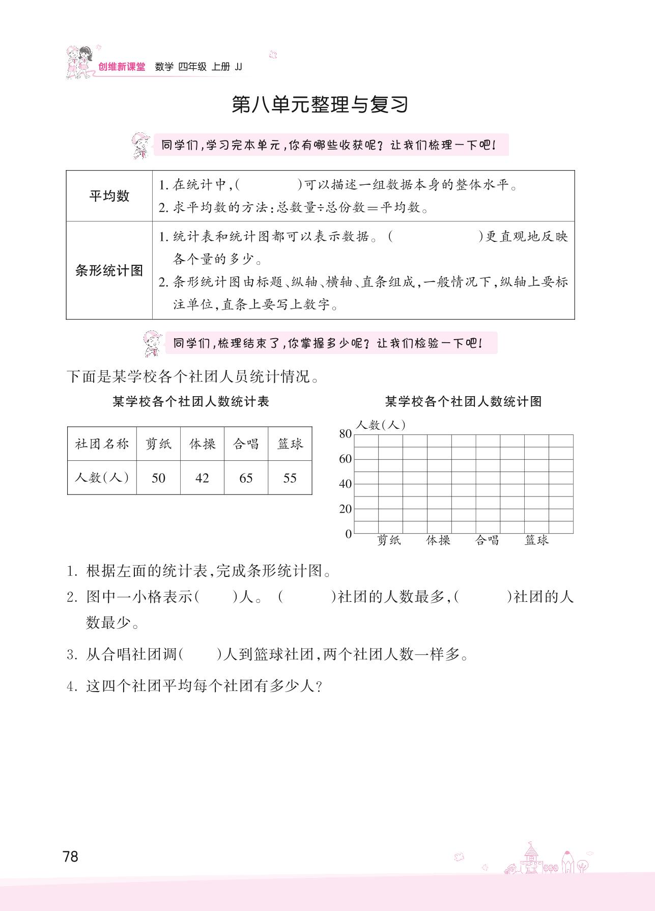 2022上册四年级数学冀教版 八 平均数和条形统计图——第八单元整理与复习