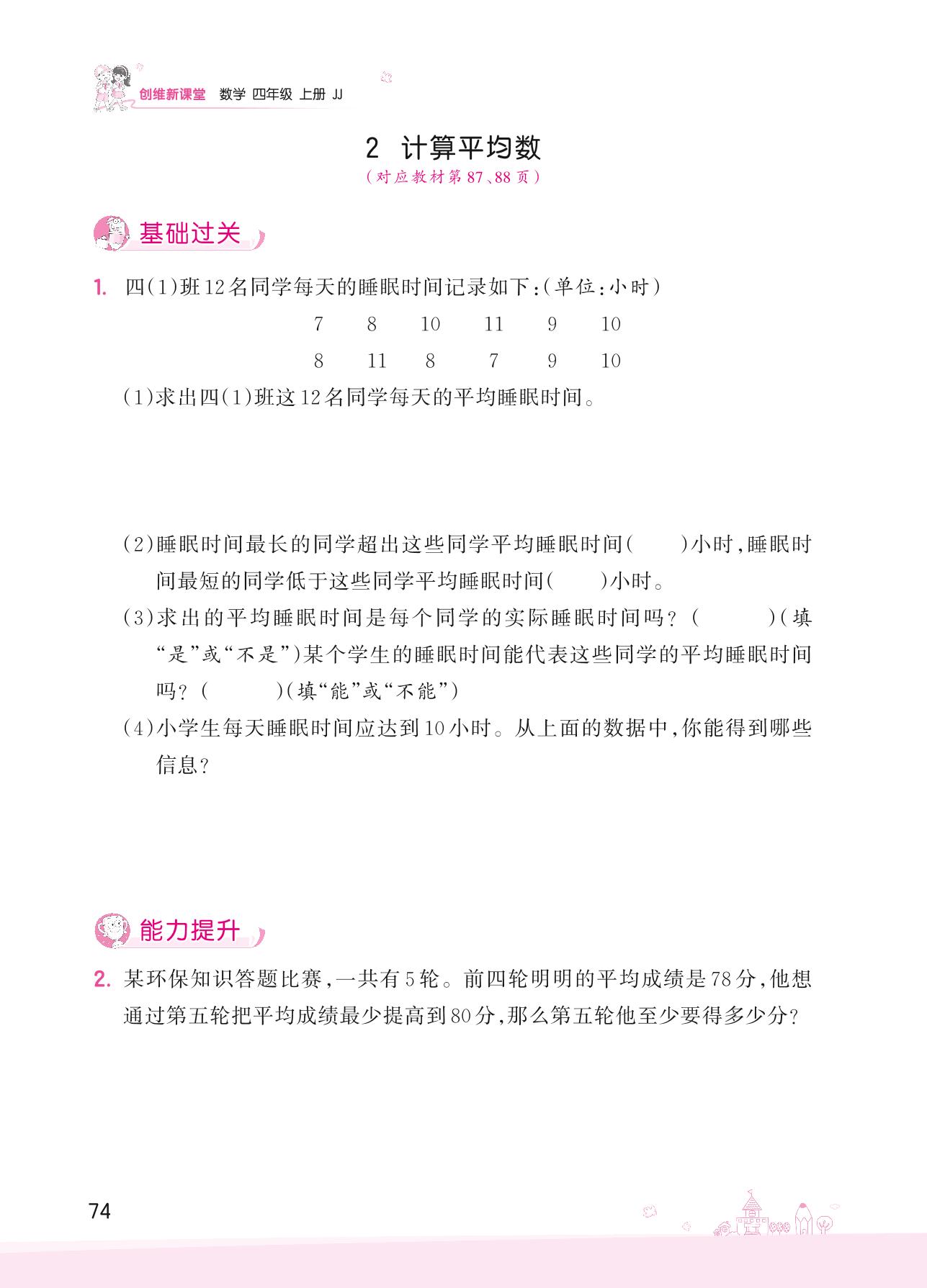 2022上册四年级数学冀教版 八 平均数和条形统计图——2 计算平均数