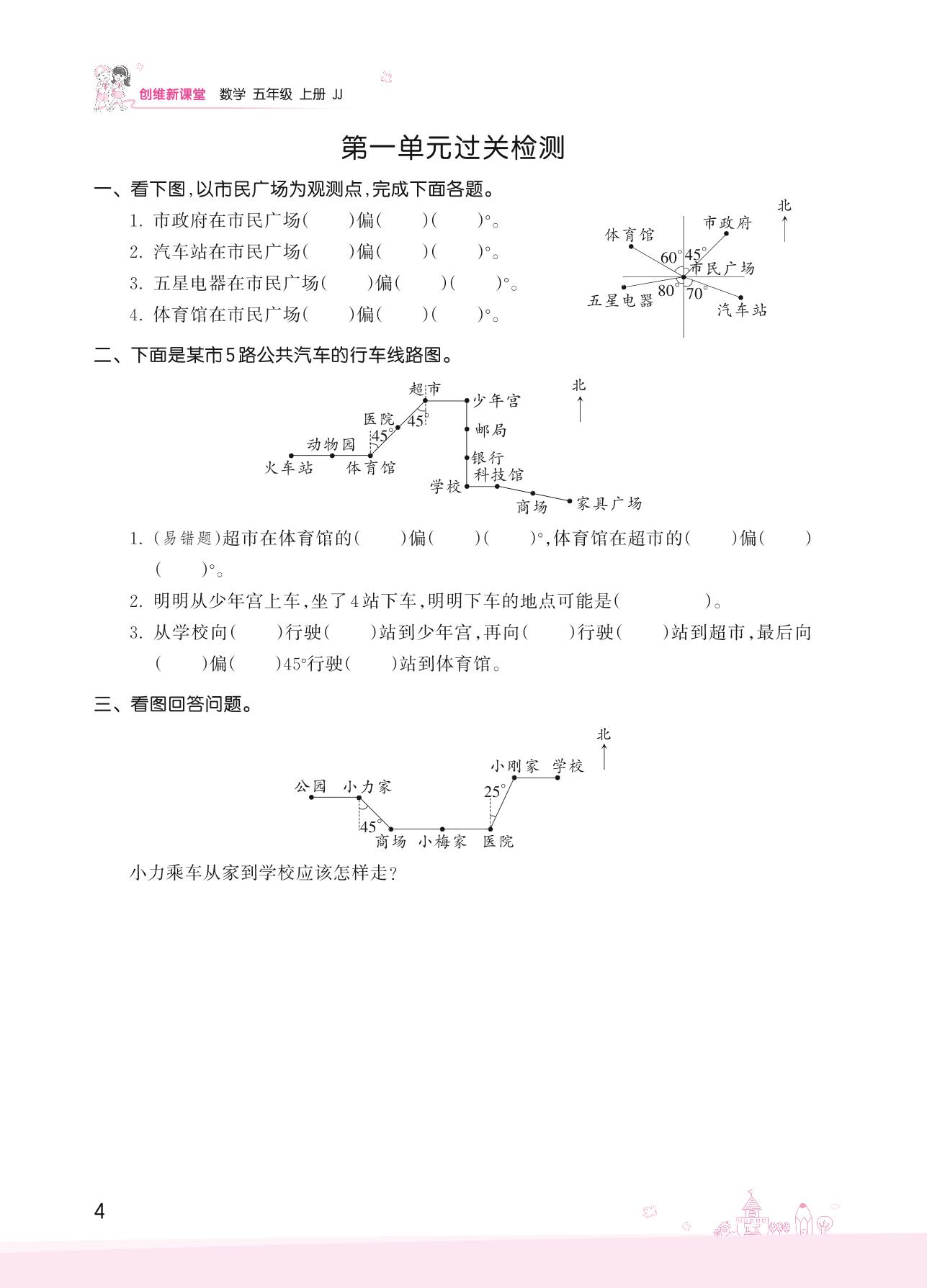 2022上册五年级数学冀教版 一 方向与路线——第一单元过关检测