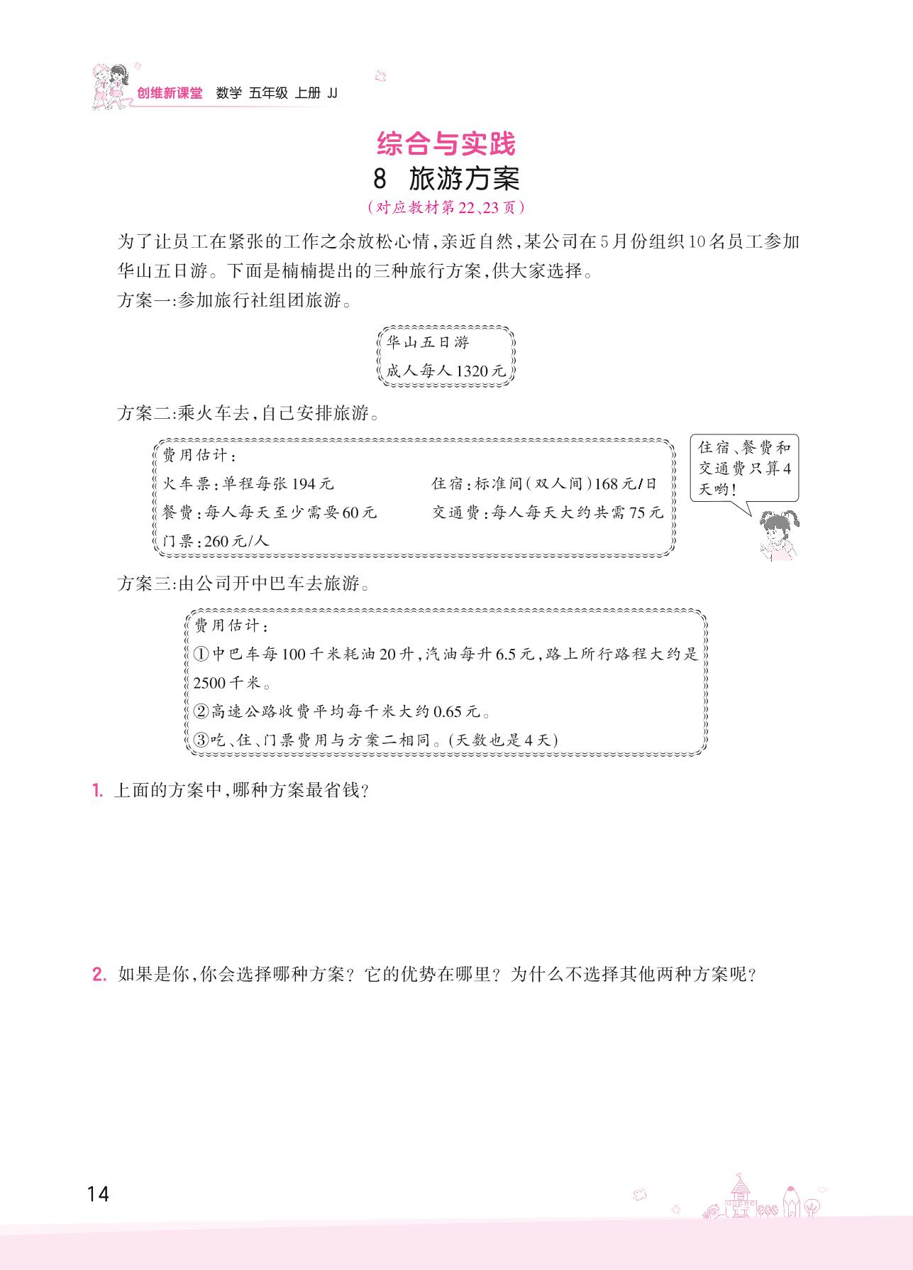 2022上册五年级数学冀教版 二 小数乘法——8 旅游方案