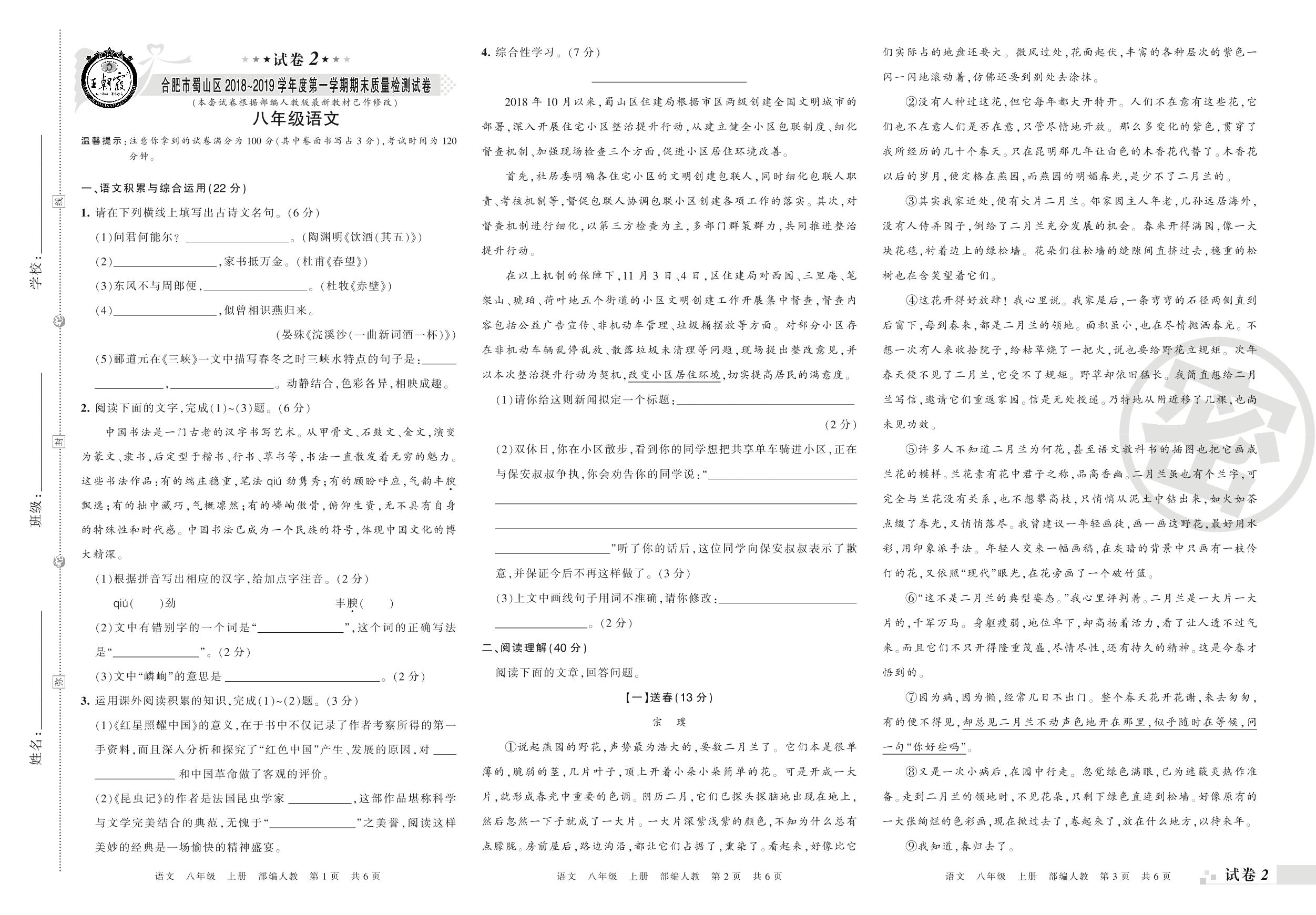 2018-2019学年第一学期合肥市蜀山区八年级语文试卷(人教版)【2】