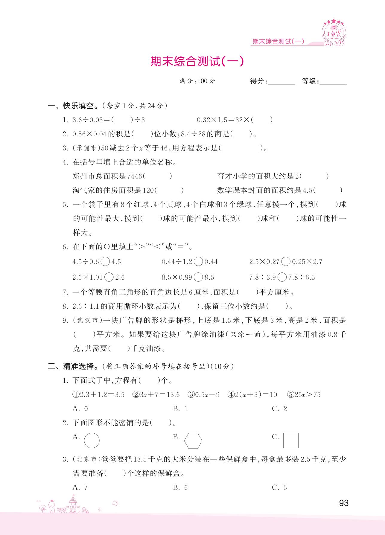 2022上册五年级数学冀教版 期末综合测试(一)