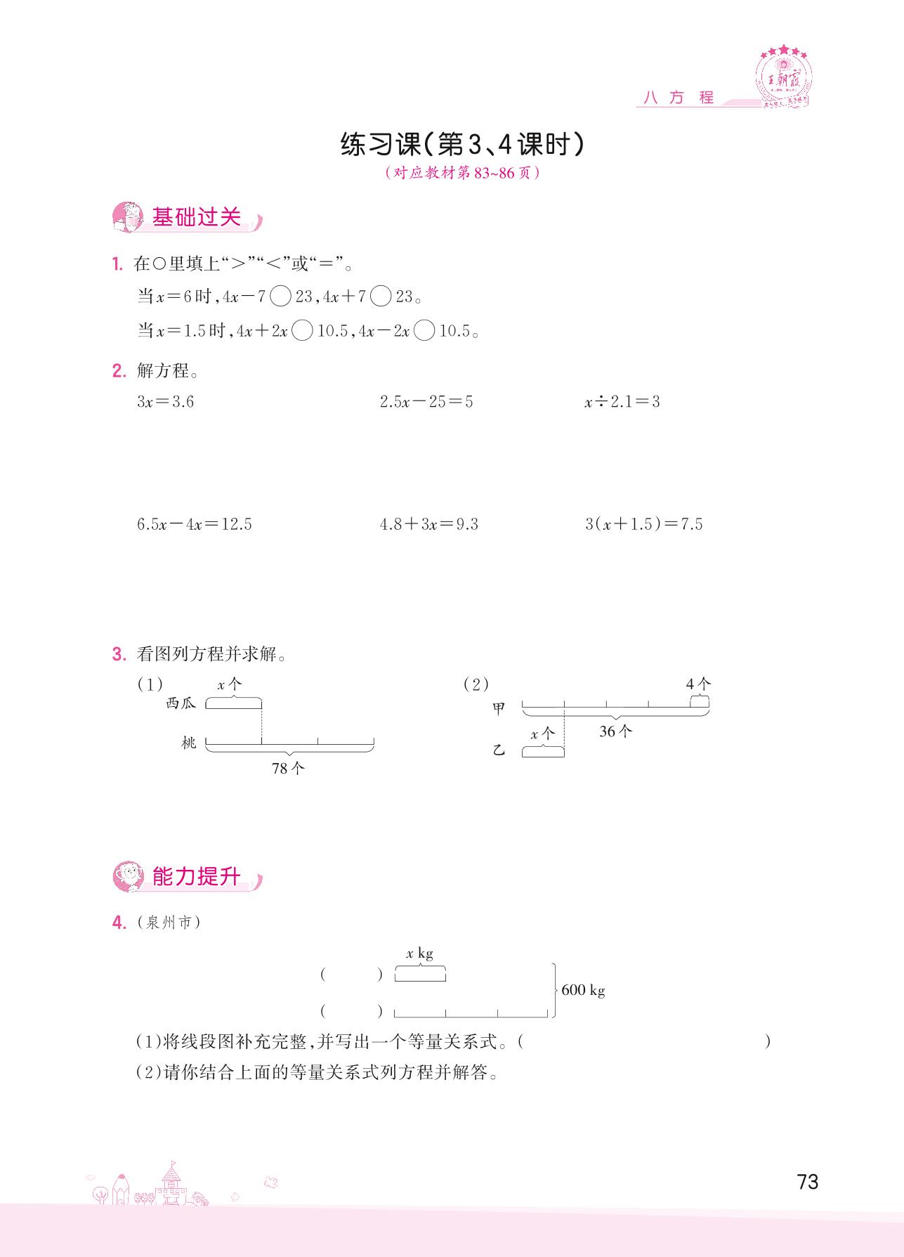 2022上册五年级数学冀教版 八 方程——练习课(第3、4课时)