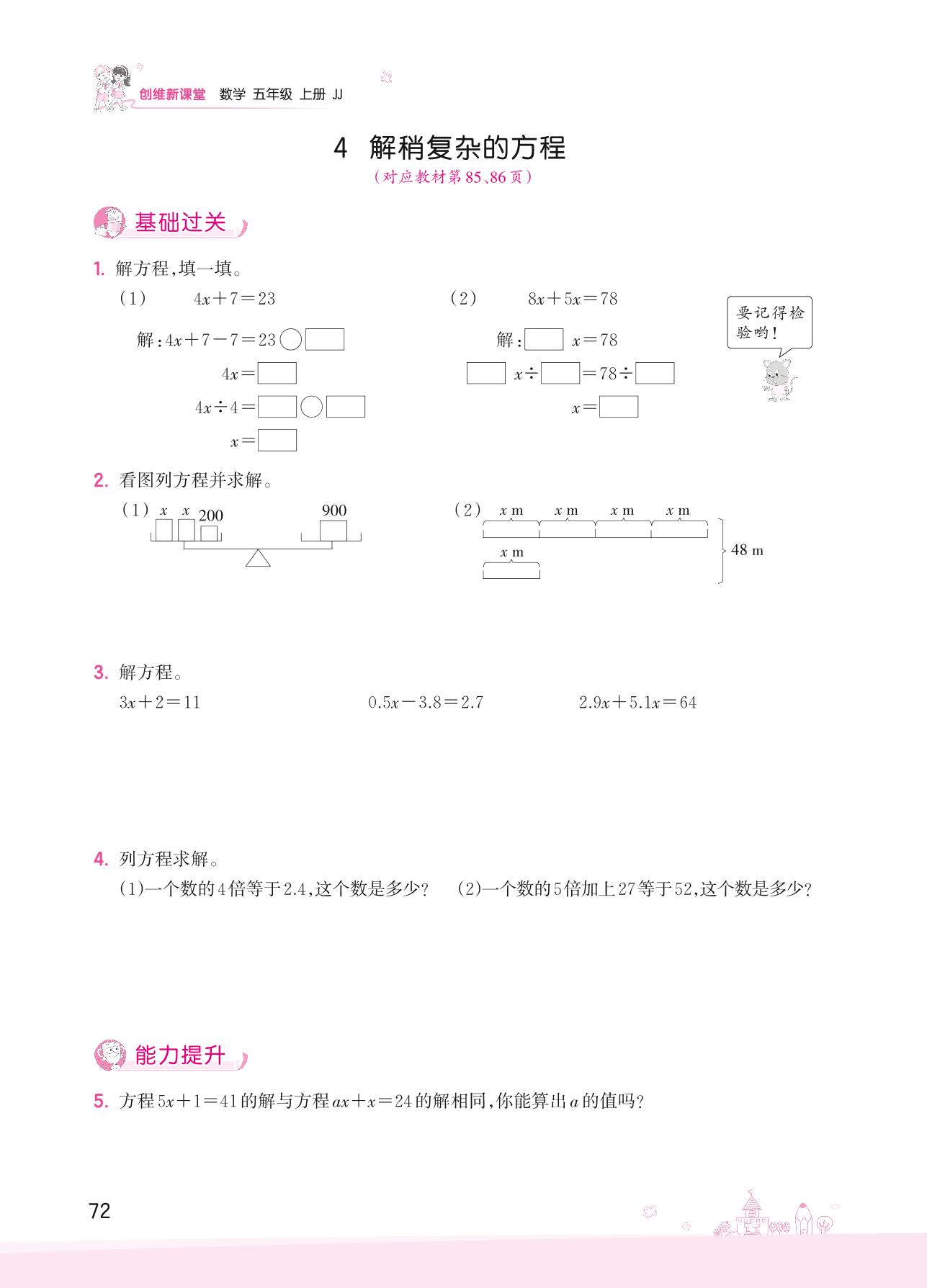 2022上册五年级数学冀教版 八 方程——4 解稍复杂的方程