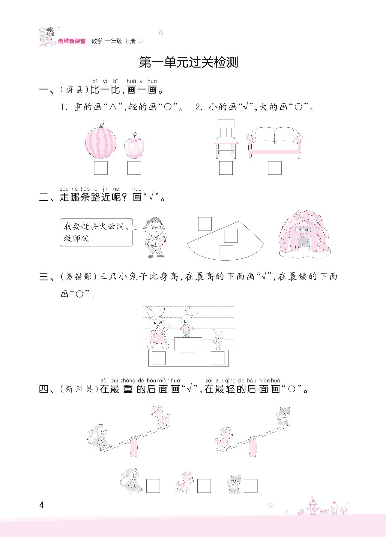 2022上册一年级数学冀教版 一 比一比——第一单元过关检测