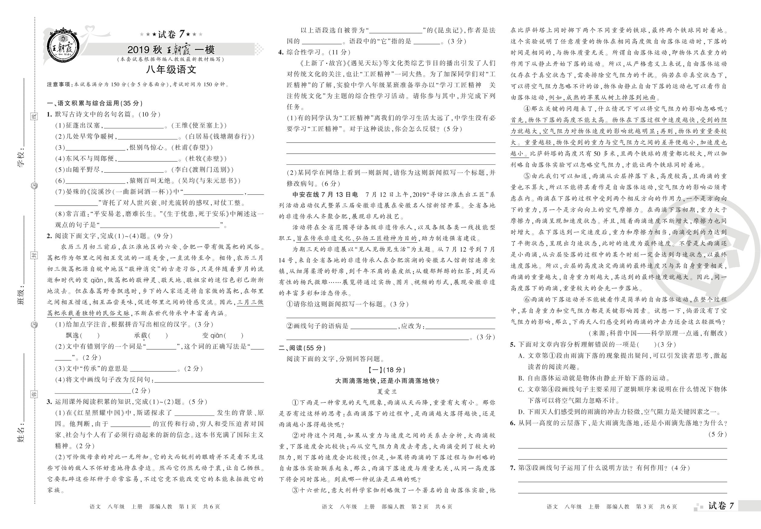 王朝霞期末模拟卷八年级上册语文(人教版)_R21080233051【7】