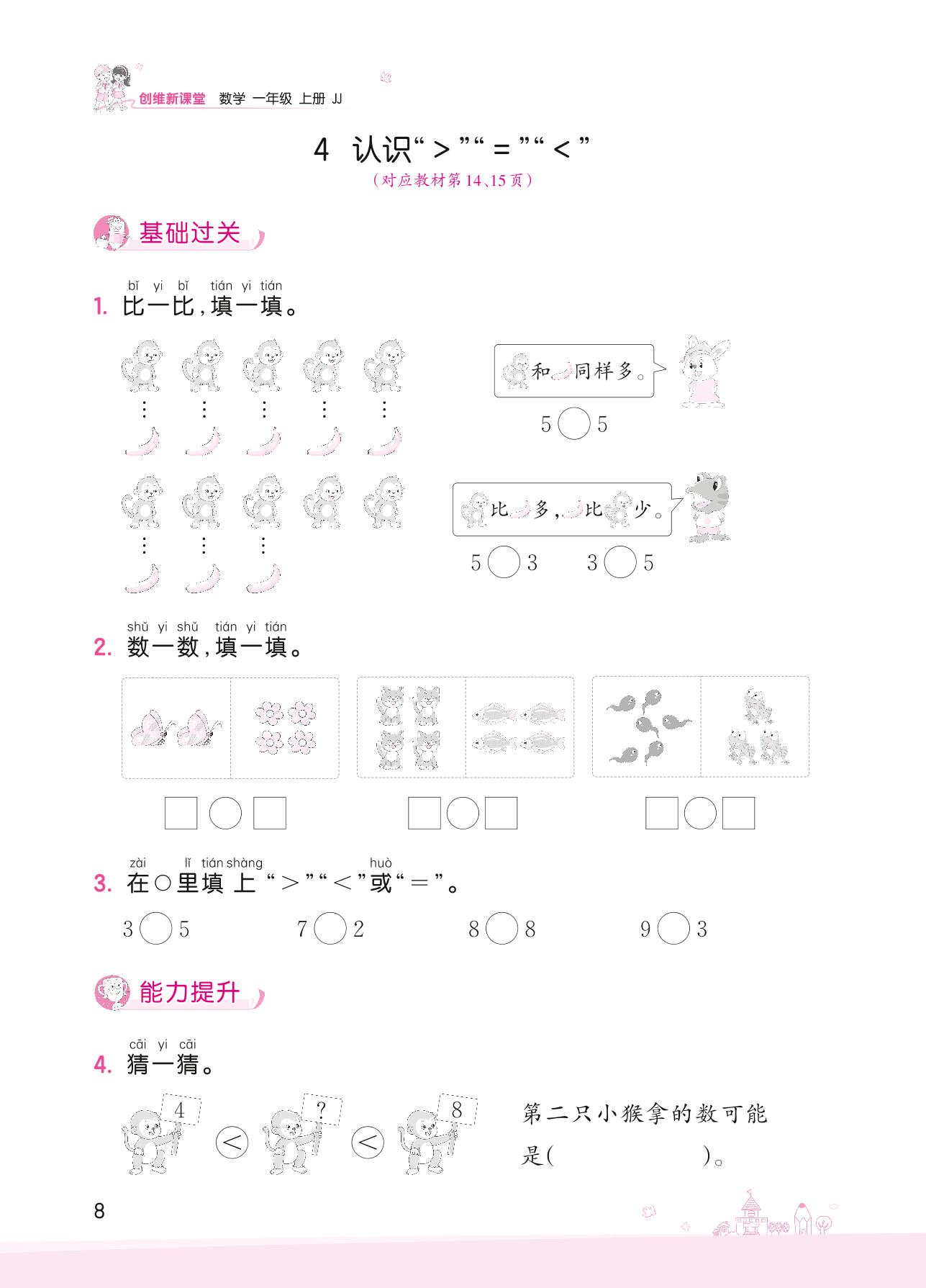 2022上册一年级数学冀教版 二 10以内数的认识——4 认识“>”“=”“<”