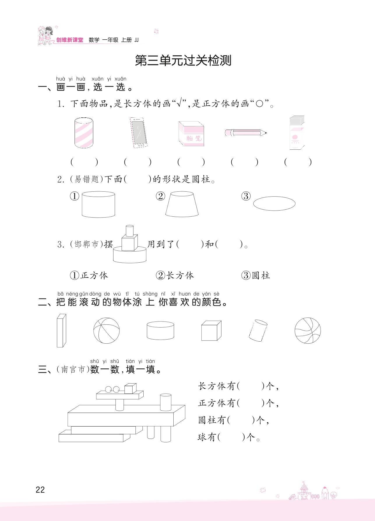 2022上册一年级数学冀教版 三 认识图形(一)——第三单元过关检测
