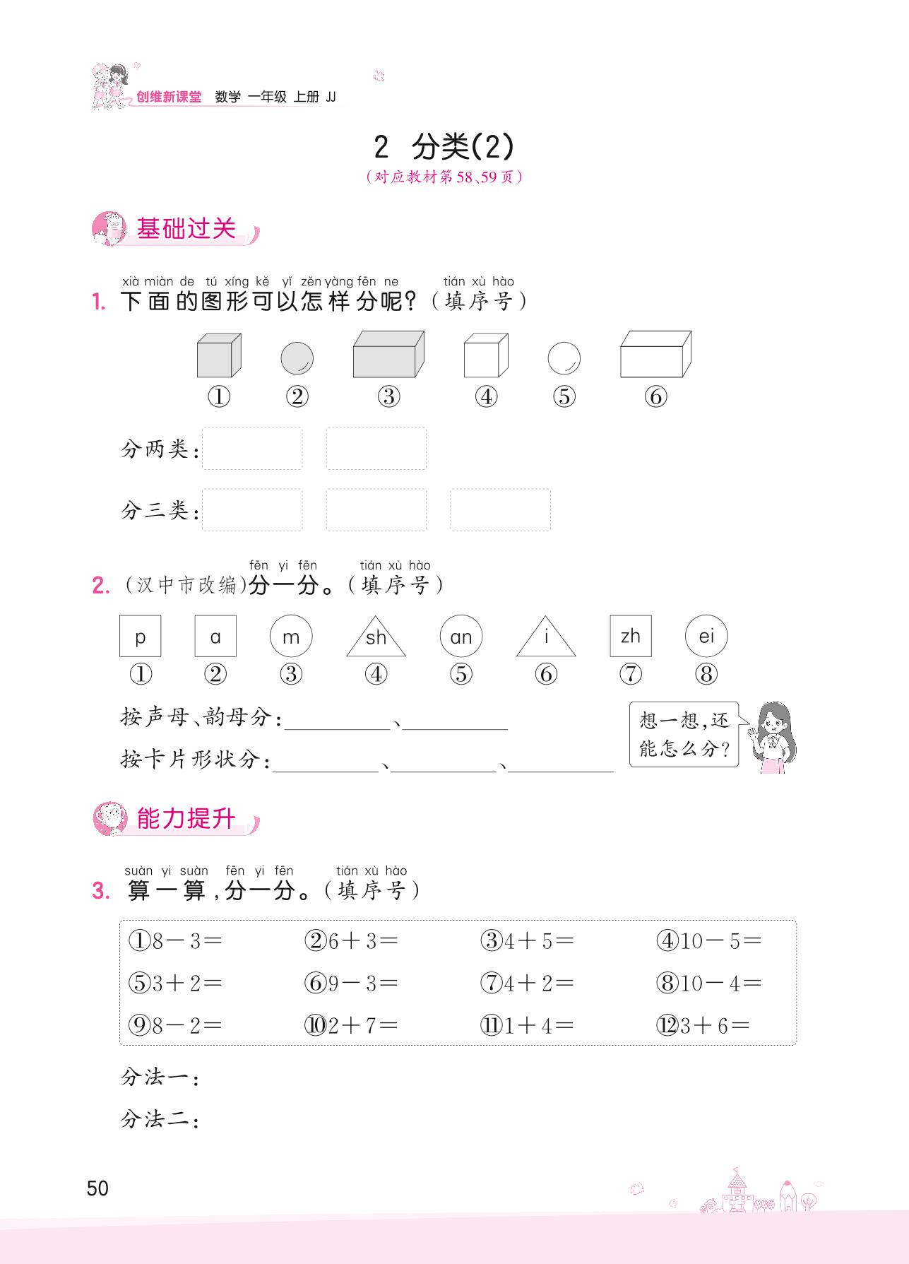 2022上册一年级数学冀教版 六 分类——2 分类(2)