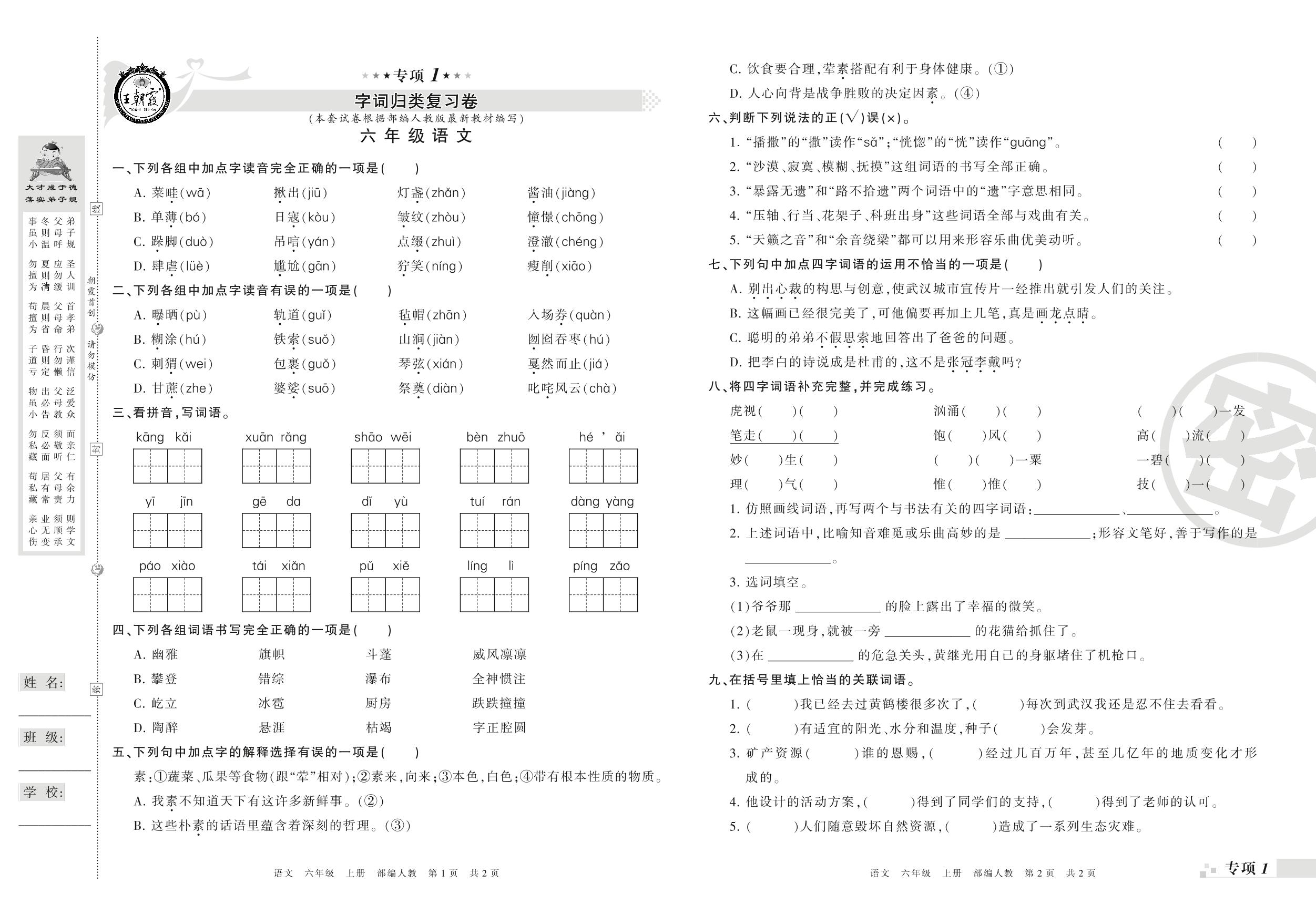 王朝霞期末专项卷——字词、句子与口语交际归类复习六年级上册语文(人教版)_R21080233118【0】