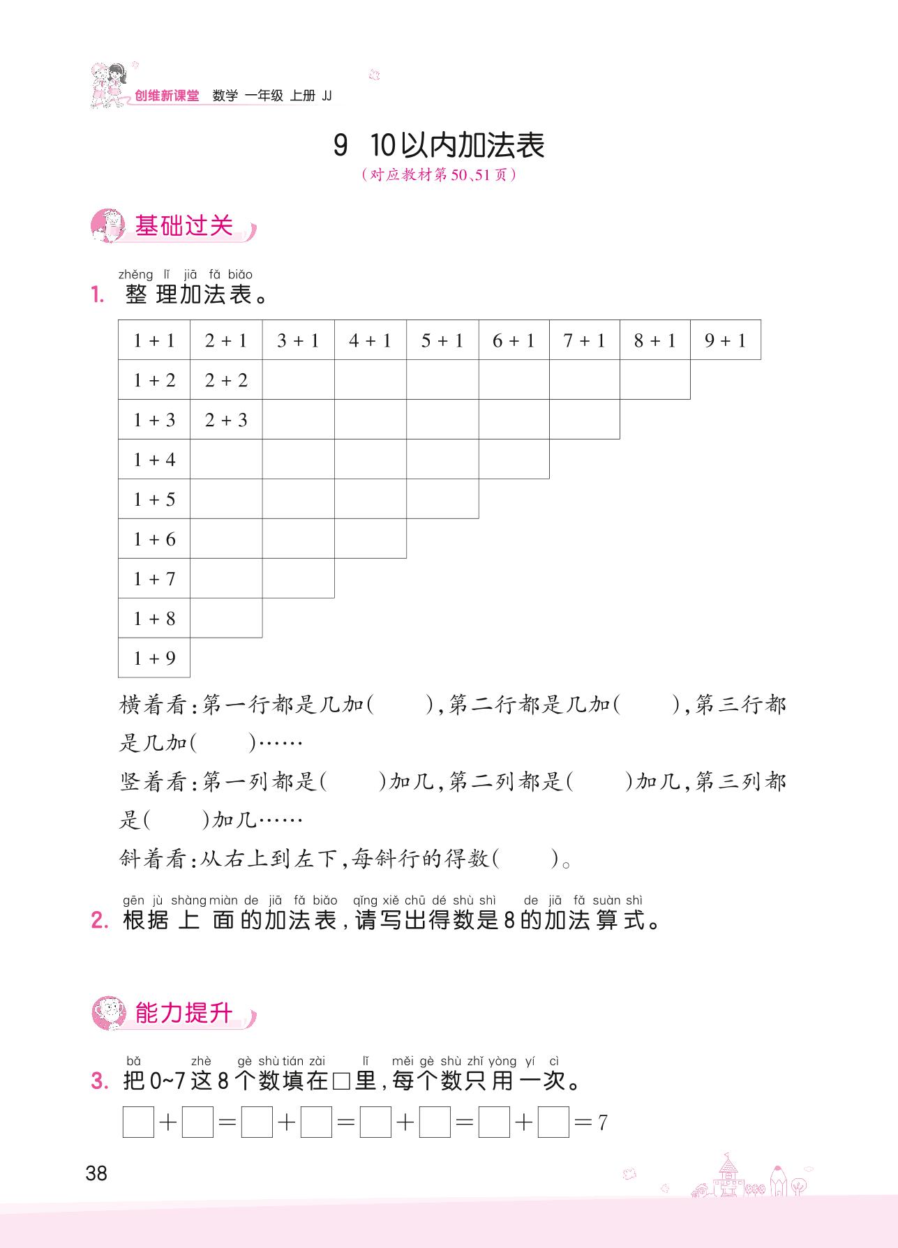 2022上册一年级数学冀教版 五 10以内的加法和减法——9 10以内加法表