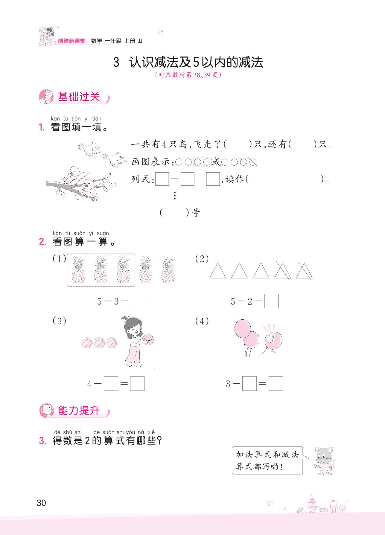 2022上册一年级数学冀教版 五 10以内的加法和减法——3 认识减法及5以内的减法