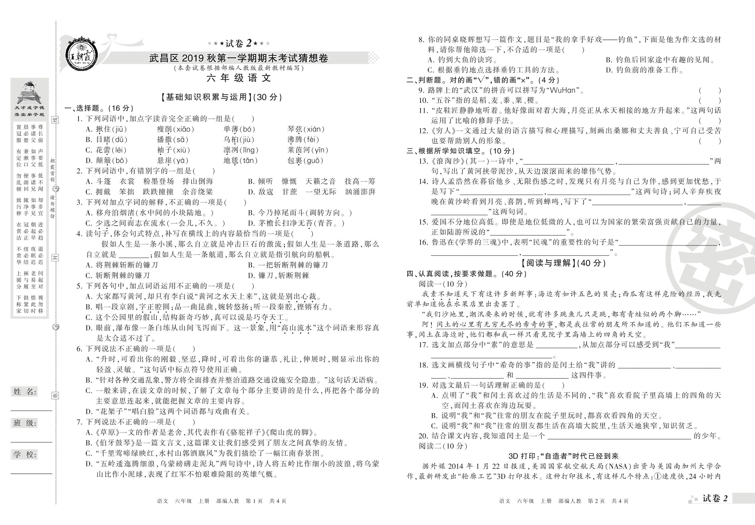 2019-2020学年第一学期武汉市武昌区猜想卷六年级语文试卷(人教版)【2】