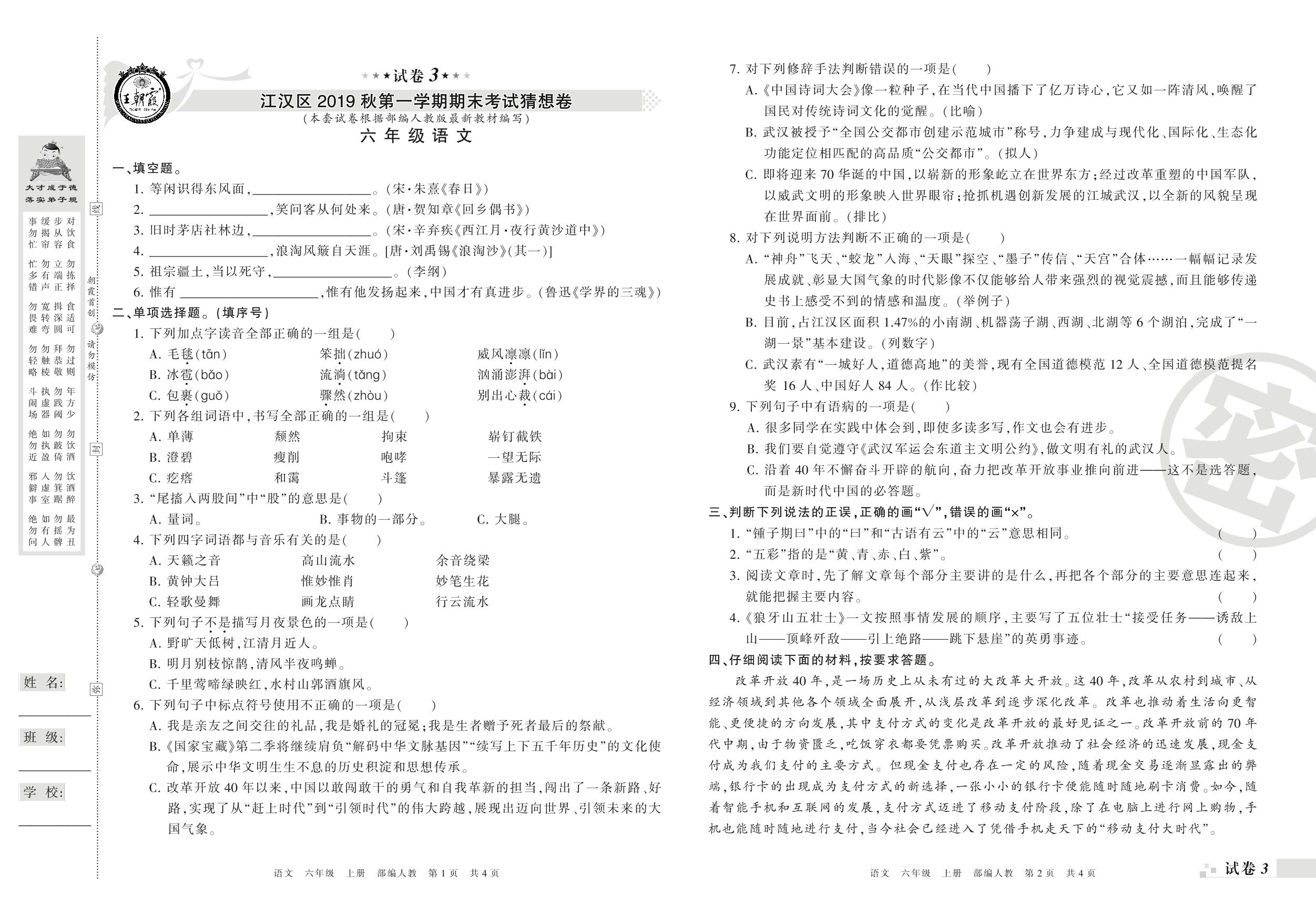 2019-2020学年第一学期武汉市江汉区猜想卷六年级语文试卷(人教版)【3】