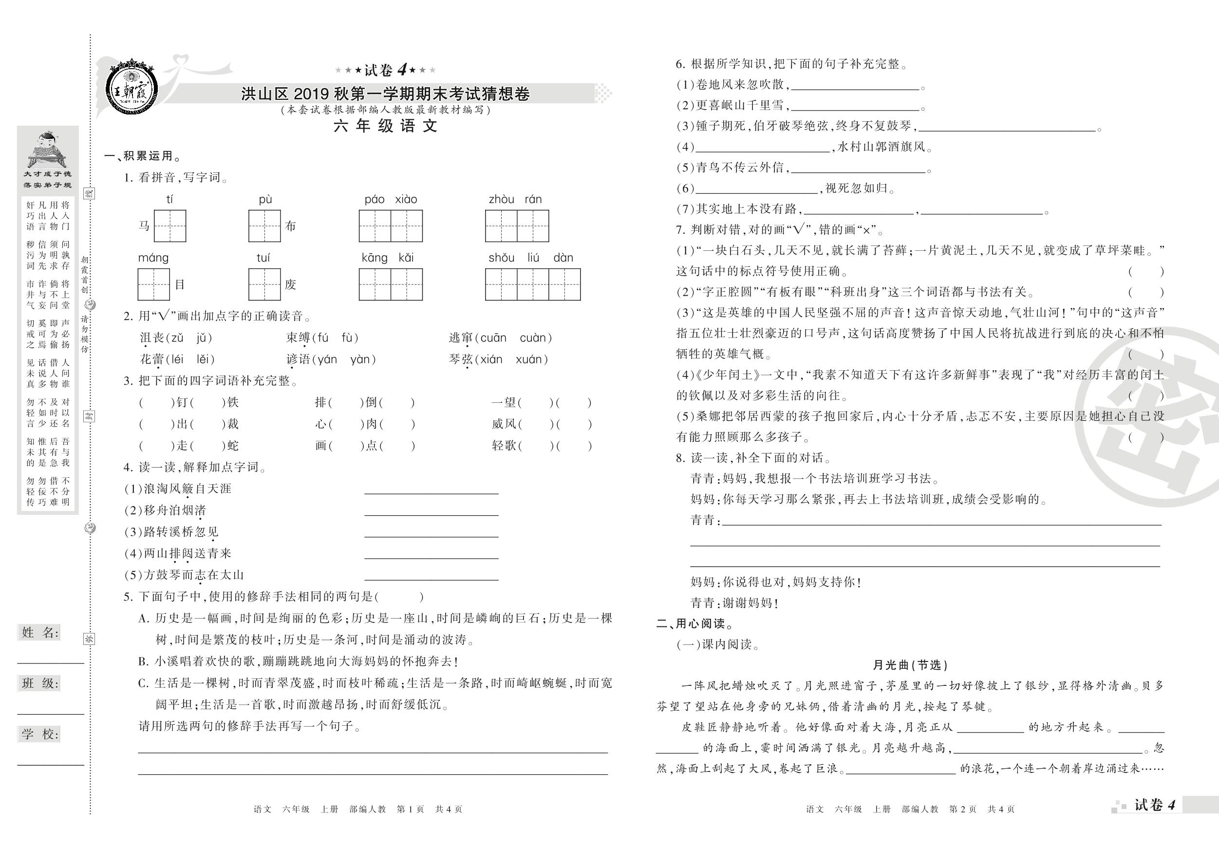 2019-2020学年第一学期武汉市洪山区猜想卷六年级语文试卷(人教版)【4】