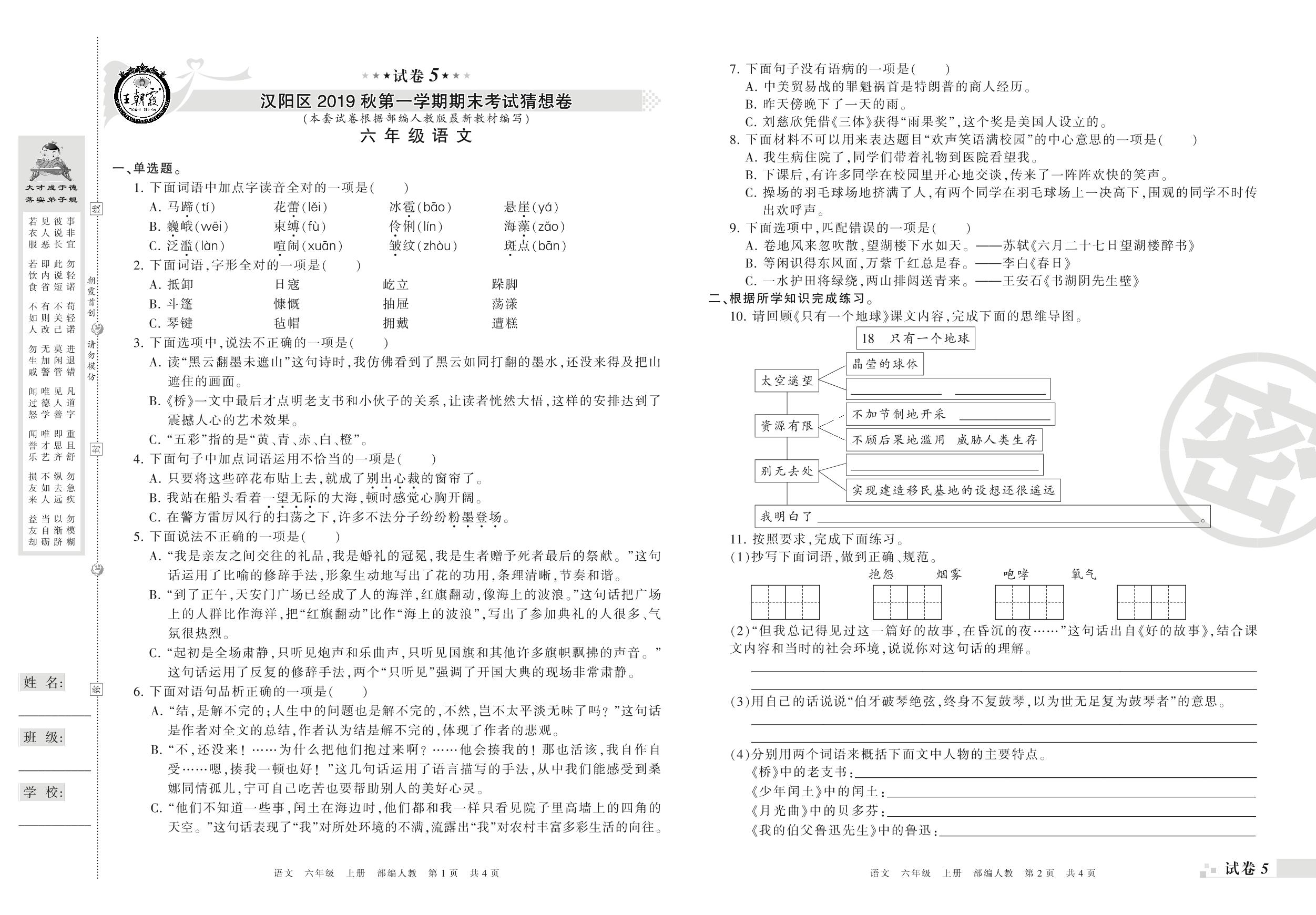 2019-2020学年第一学期武汉市汉阳区猜想卷六年级语文试卷(人教版)【5】