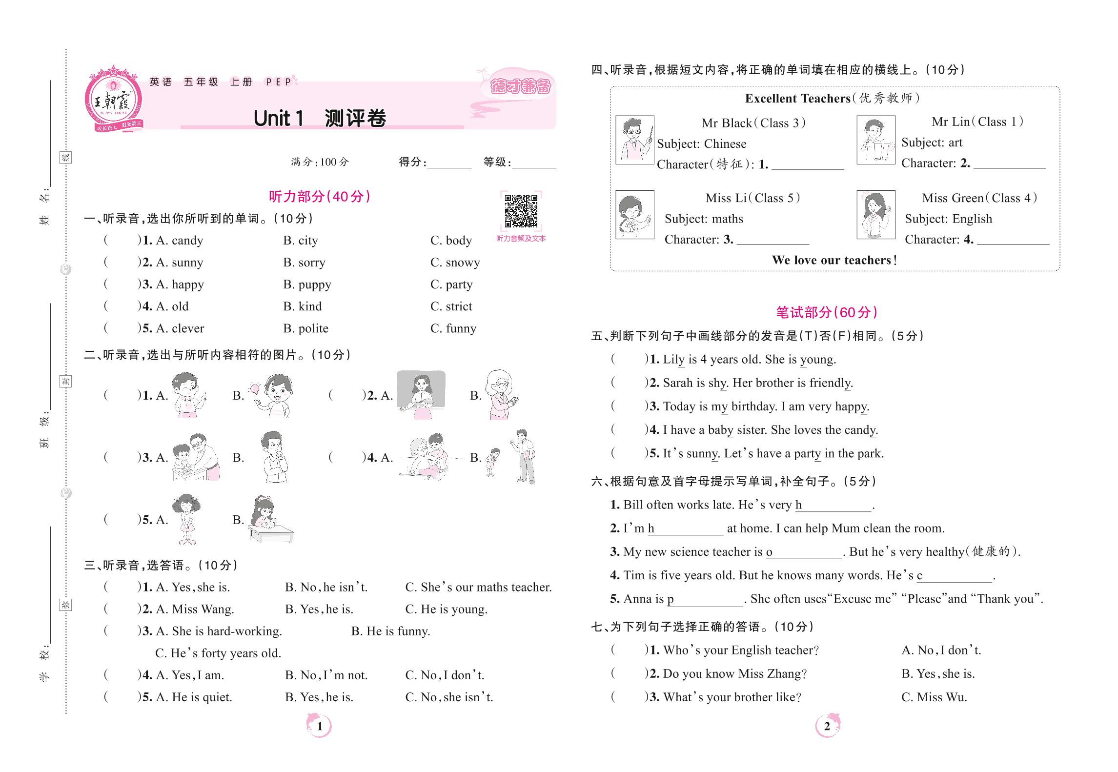 五年级英语人教PEP版(三起始)上册单元卷