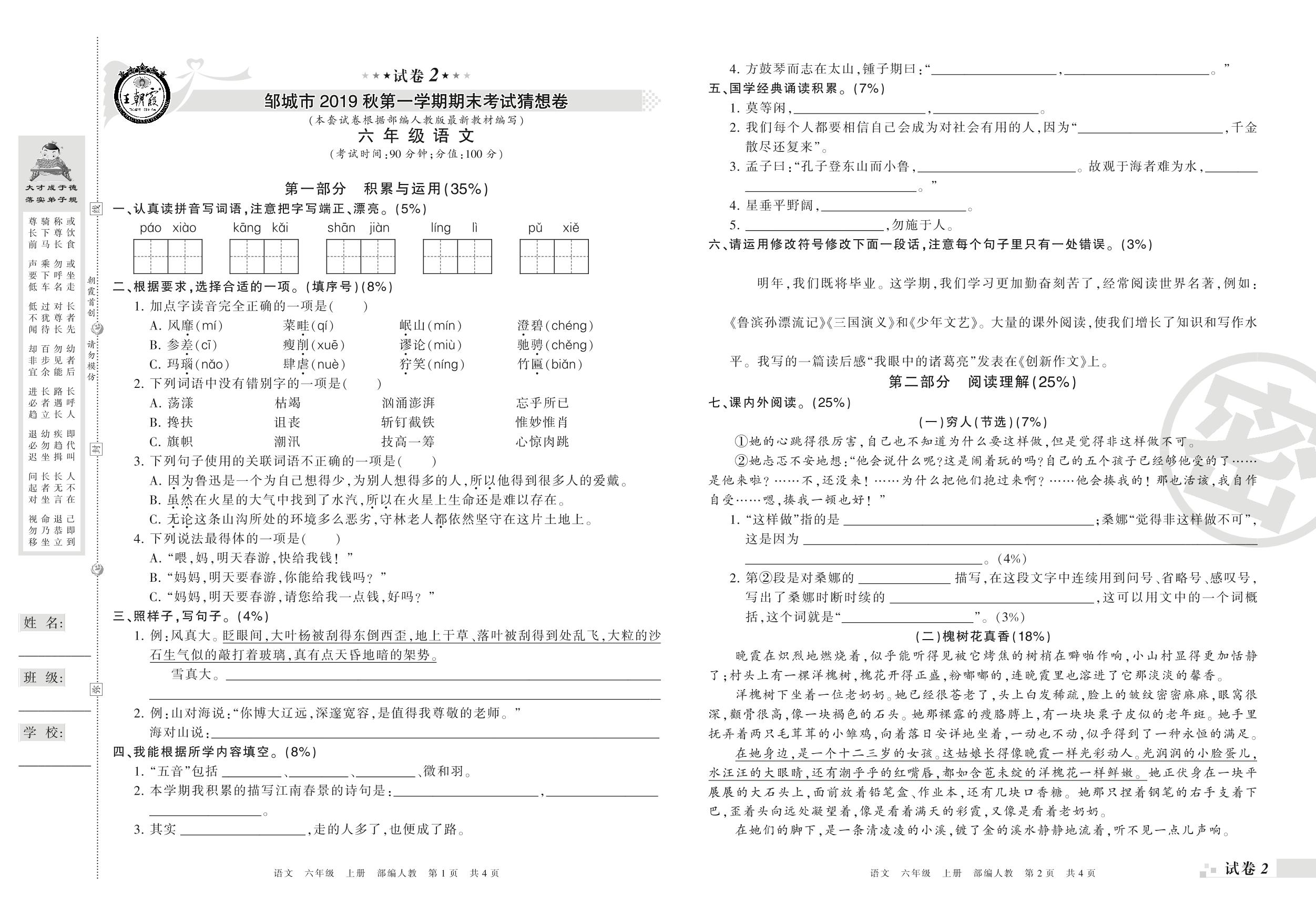 2019-2020学年第一学期邹城市猜想卷六年级语文试卷(人教版)【2】